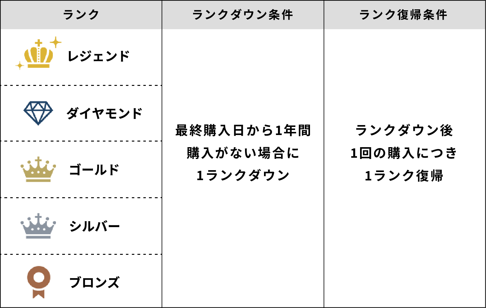 最終購入日から1年間購入がなかった場合、1年ごとに1ランクダウンします。
