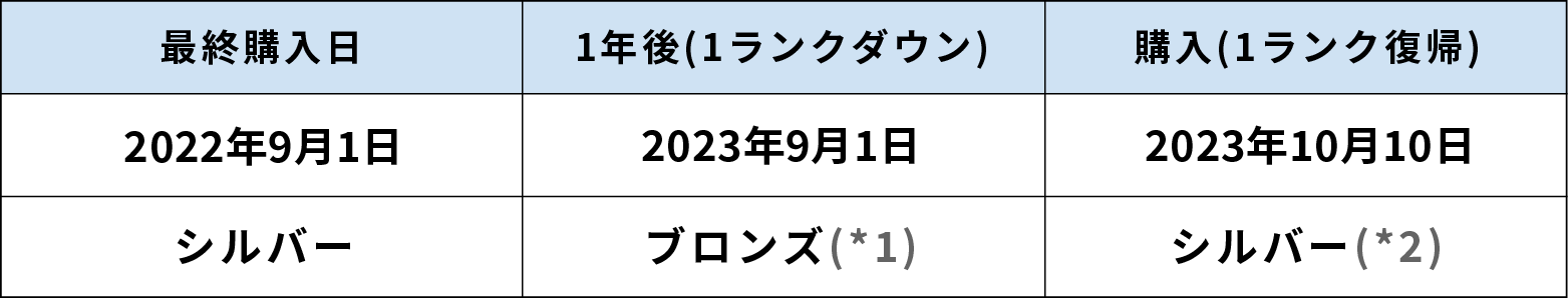 ※1 最終購入日から1年間購入がないため1ランクダウンします