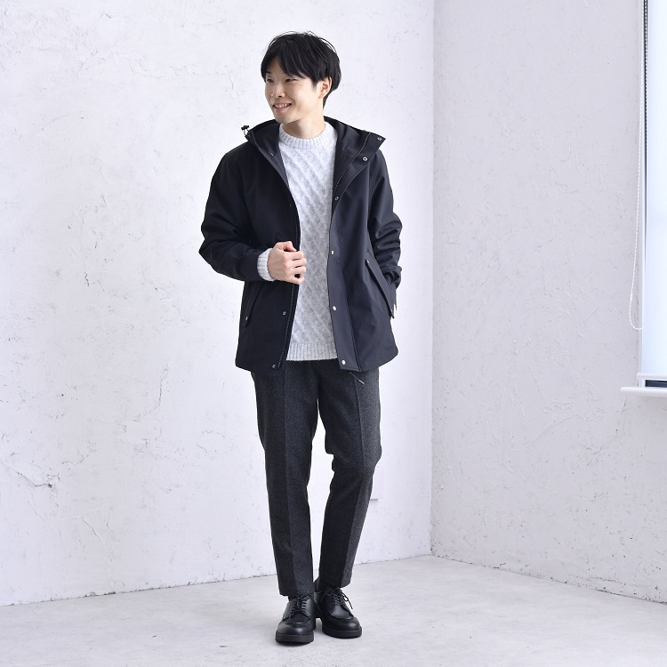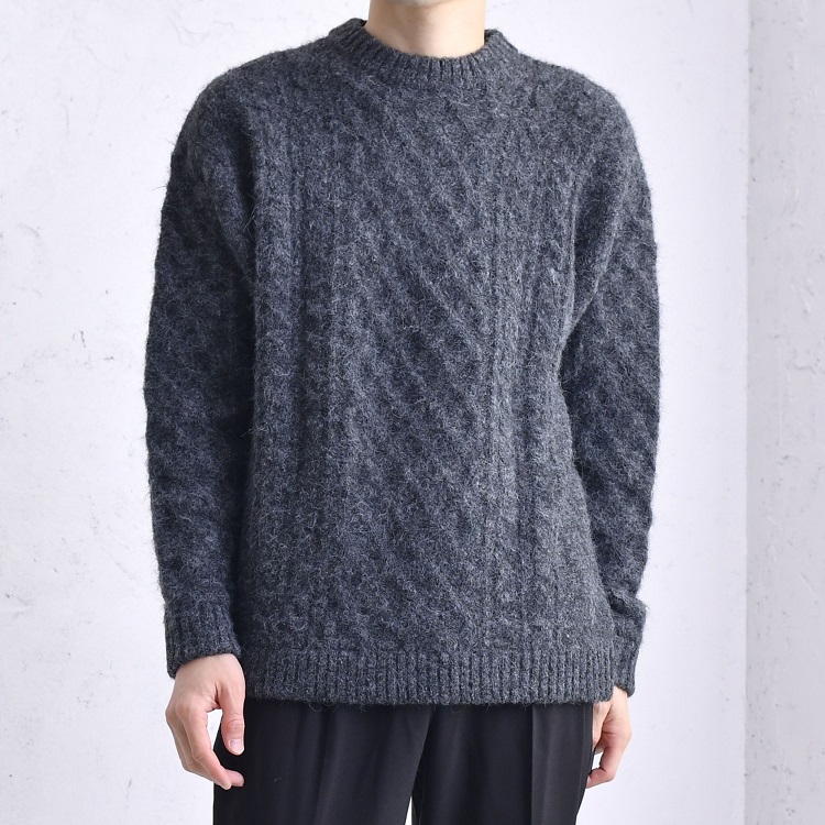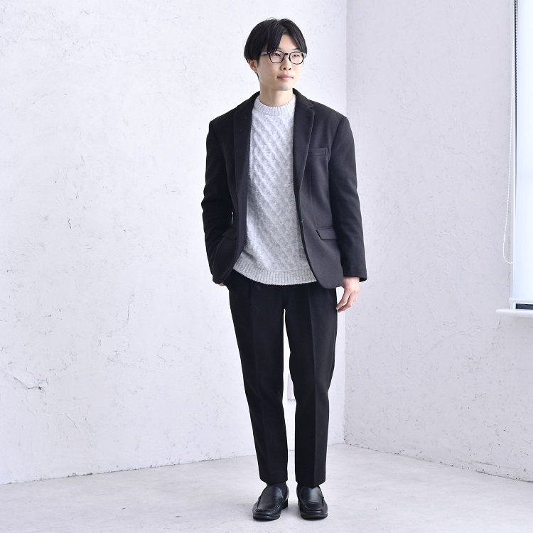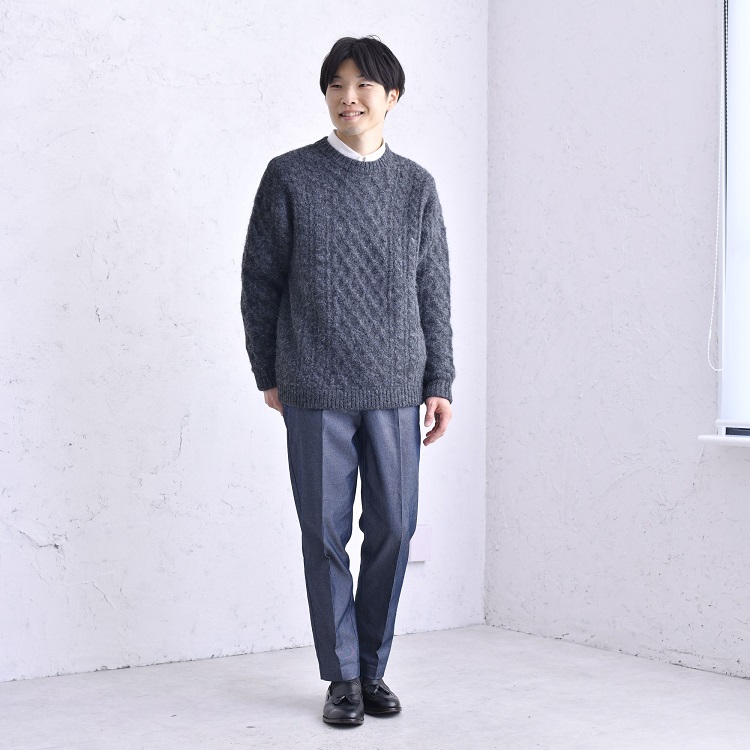 早いもので、11月もあと1週間もありません。 どうします・・・? …いや別にどうするということもないのですが、この歳になったせいでしょうか。 この時期はなんか気持ちが焦ってしまいます。 これからクリスマス、年越し、お正月と、イベントも盛りだくさん。 人と会うことも増えるのでは? そしたらやっぱり、服装には気を遣いたいですよね。「大人っぽくてオシャレ」って思われたいですよね。 ではでは、そんな11月ラスト回。はじめますよー! ※当コラムは、30~40代の男性に向け、“これからのオシャレ”を楽しむために「今着てほしいアイテム」を特集していきます。 ライター:ササ 37歳の会社員で2児の父。オシャレでカッコイイ40代になることを直近の目標に据えている。 子どもが産まれてからどんどんカジュアルスタイル一辺倒になっているのが悩み。 ⇒バックナンバーを見る さあ、そんな今回のご紹介アイテムは・・・ タカシ シャギーアラン編みのニットでいこう! ササ シャ、シャギー?アラン編み? シャギーアラン編みニットって何? ササ おお、これがシャギーアラン編みニットなんですね。なんか女性っぽい雰囲気もある。 タカシ そう。流行はレディースからメンズに流れてくるからね。 そんなことも知らなかった僕は、バイヤーのタカシにこのニットの魅力を教えてもらったのであった。 シャギーとは? シャギーというのは「毛足の長い」という意味。 毛足の長いニット生地を使うことで、多くの空気の層ができ、暖かさとやわらかさを感じられます。 この毛足の長いニットが、昨年レディースで大流行。 そして今年、メンズでも多く登場してきているのです。 アラン編みとは? アラン編みとは、アイルランド発祥のアラン模様に編み上げたもの。 寒い地域の漁師のために編まれたのが始まりで、男性にもピッタリのアクセントに。 太めのアラン編みがしつこくない存在感で、大人が着るためのトレンドニットに仕上がっています。 ミラノリブニットと比べてみた ということで、シャギーアラン編みニットと、編み目の詰まったミラノリブニットを着比べてみました。 はい!同じニットでも違いは明らかですね。 いくつか気づいた点を挙げていきます。 コーデのアクセントになる(イメチェンできる!?) ミラノリブニットは上品で大人っぽい印象が強いですが、シャギー(毛足が長い)の効果でカジュアルさ、親しみやすさがあります。 また、アラン編みの存在がシンプルなコーデでもアクセントを付けてくれます。 あまり着たことがないという方は、これ1着で一気にイメチェンできるはずです…! あたたかさが段違い 毛足が長いため、空気感がたっぷりです。もうふわっふわ。 同じクルーネックのニットでも、ミラノリブとは比較にならないくらいあたたかいです。 寒さが一気に厳しくなったこれからの時期のお出かけには頼れますね。 逆に、暖房がしっかり効いている屋内で長時間過ごすときや、体を動かす場面では暑いと感じるかも… ゆったりシルエットの妙 シルエットは結構ゆったりめです。 着丈や袖丈がちょうどいいMサイズを着ても、身幅にはゆとりがあります。 そのため、1枚でも今っぽいこなれた着こなしになり、中にシャツなどを重ね着しやすいというメリットが! 注意点!毛が抜けやすい こちらのニット、毛足が長いため、正直毛が抜けやすいです。 そして抜けた毛が目立つ…。長いから… 他の服に毛が付着してしまったら、コロコロなどで取り除き、清潔感を保つようにしましょう。 ササ なんだかんだインパクト強めのアイテム。その分上級者な着こなしができる!という印象のアイテムです。 【コーデ例】優しい風合いを生かしたコーデ 今年のトレンドのひとつに、グレーを使った都会的なモノトーンコーデがあります。 このニットのカラーは、明るさのあるオフグレーと、クールなチャコールの2種類。 タカシ この冬はアーバン(都会的)な着こなしを楽しんでみてください。 大人っぽさが手軽に作れる黒のセットアップコーデ オススメのモノトーンコーデを作ってみました。 コーデ作りが簡単で、かつ統一感と大人らしさのあるセットアップコーデ。 黒のセットアップのインナーに、オフグレーのシャギーニットを着ることで、明るさと優しい雰囲気を加えることができます。 着用アイテム 冬用テーラードジャケット シャギーアラン編みニット 冬用テーパードパンツ ローファー メガネ マウンテンパーカーのカジュアルスタイル アウターをマウンテンパーカーにすれば、アクティブな印象に。 家族連れでお出かけというシーンにもマッチするモノトーンコーデです。 着用アイテム マウンテンパーカー シャギーアラン編みニット 冬用テーパードパンツ レザーシューズ シャツinコーデでデキる大人感 ニットの襟から覗くシャツがきちんとした大人の印象を与えます。 パンツはデニムテーパードパンツ。デニムの風合いで親しみやすさを加えてみました。 着用アイテム シャギ