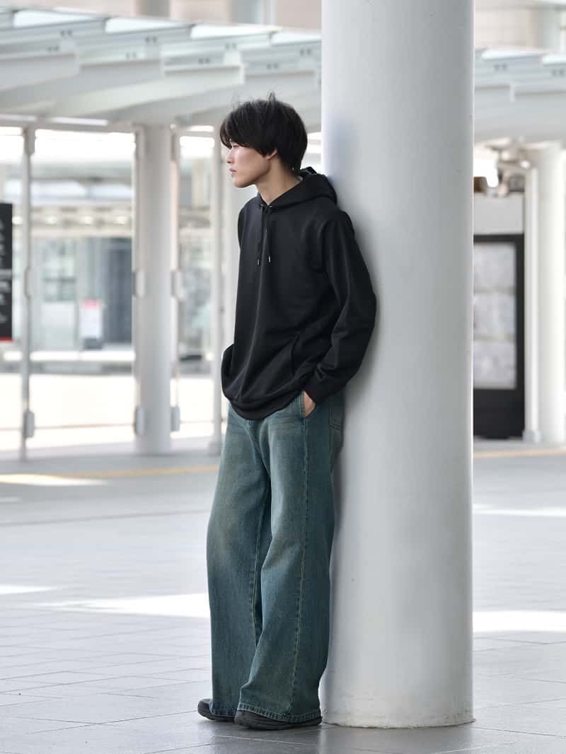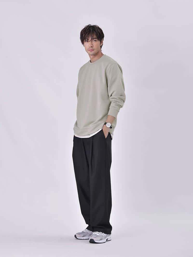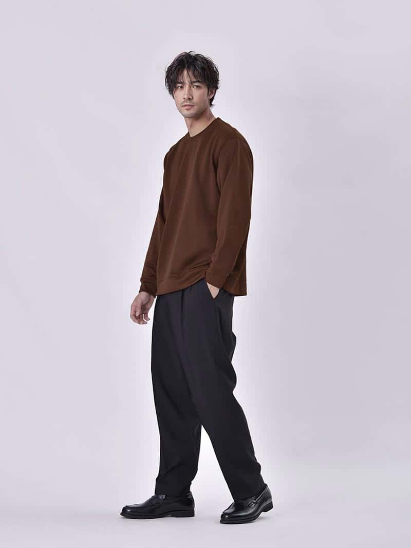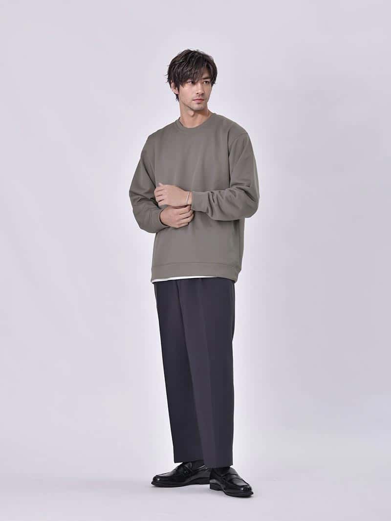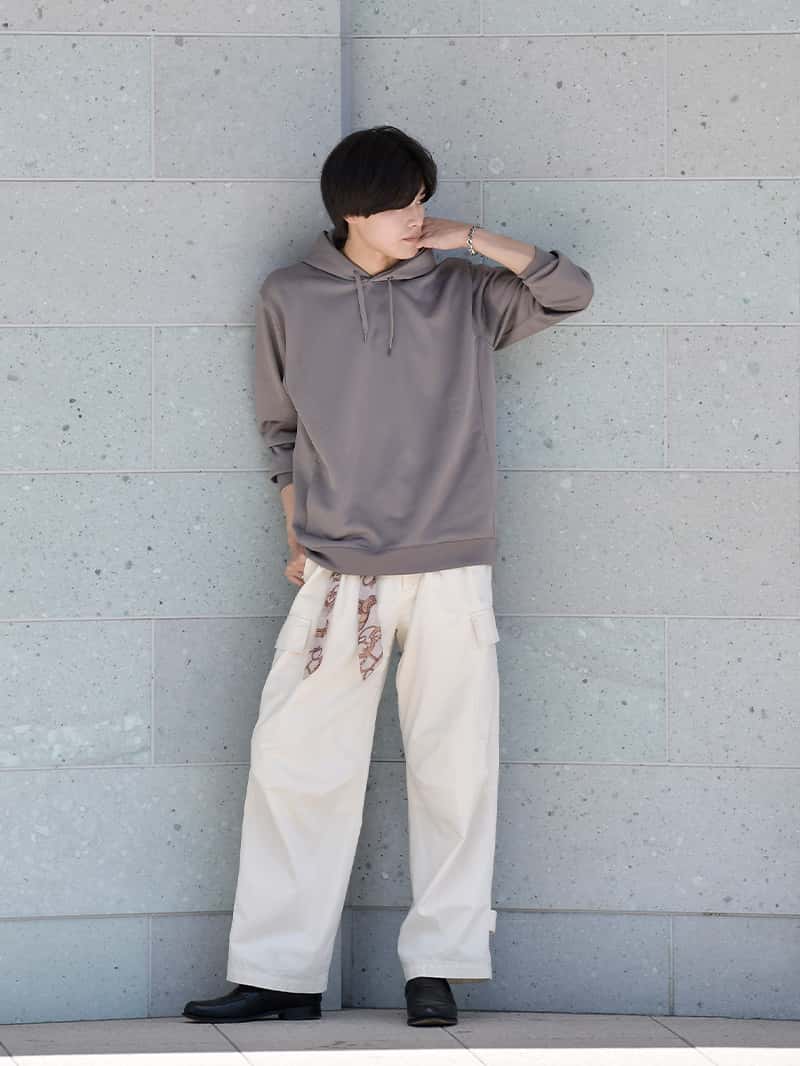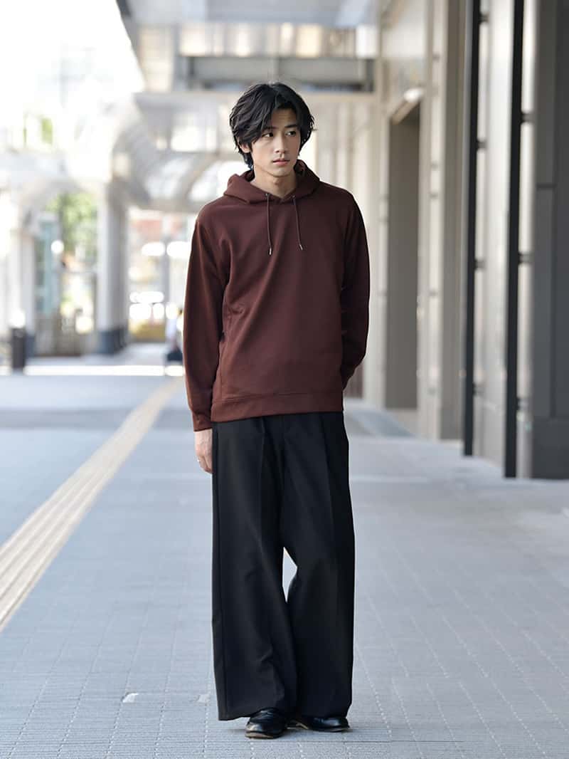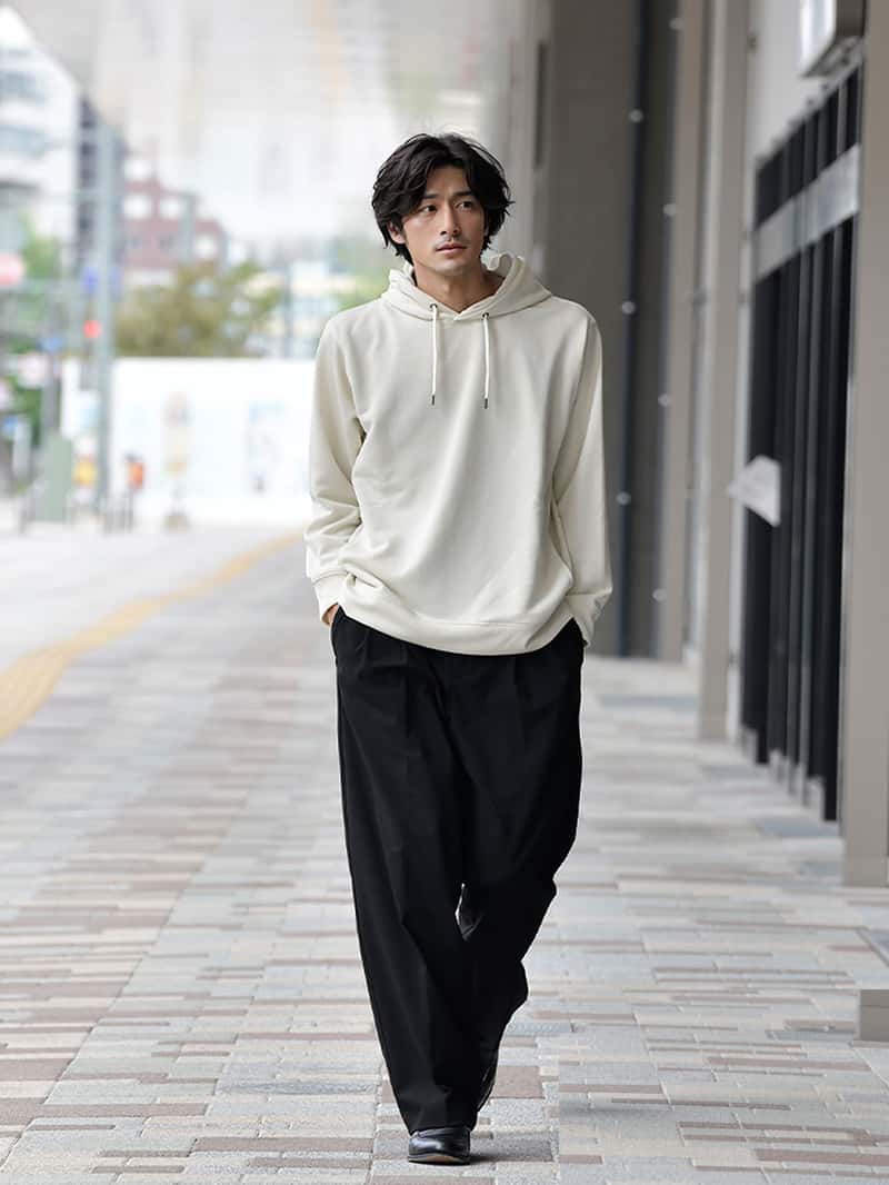パーカー、スウェットというと部屋着という印象がありますが、「大人が着るカジュアルウェア」をコンセプトに ツヤとハリのある生地で品のあるシンプルなデザインに仕上げたのがPOLISHプルパーカーとトレーナーです。 使用アイテムはこちら POLISHトレーナー¥3,990 POLISHプルパーカー¥3,990 01 スタイリッシュなシルエットが特徴のPOLISHプルパーカーは、程よくゆとりのあるパンツを合わせることでAラインシルエットに。 キレイめとカジュアルのバランスが取れた着こなしは、大人のリラックスコーデにぴったり。 秋冬のコーディネートに1枚は持っておきたい定番アイテムです。 02 ルーズなシルエットのPOLISHトレーナーは、カジュアルな着こなしに適したアイテムです。 ワイドパンツやスニーカーといった、カジュアルなアイテムとも好相性ながら、ツヤとハリのある生地で上品にまとまります。 使用アイテムはこちら POLISHトレーナー¥3,990 POLISHプルパーカー¥3,990