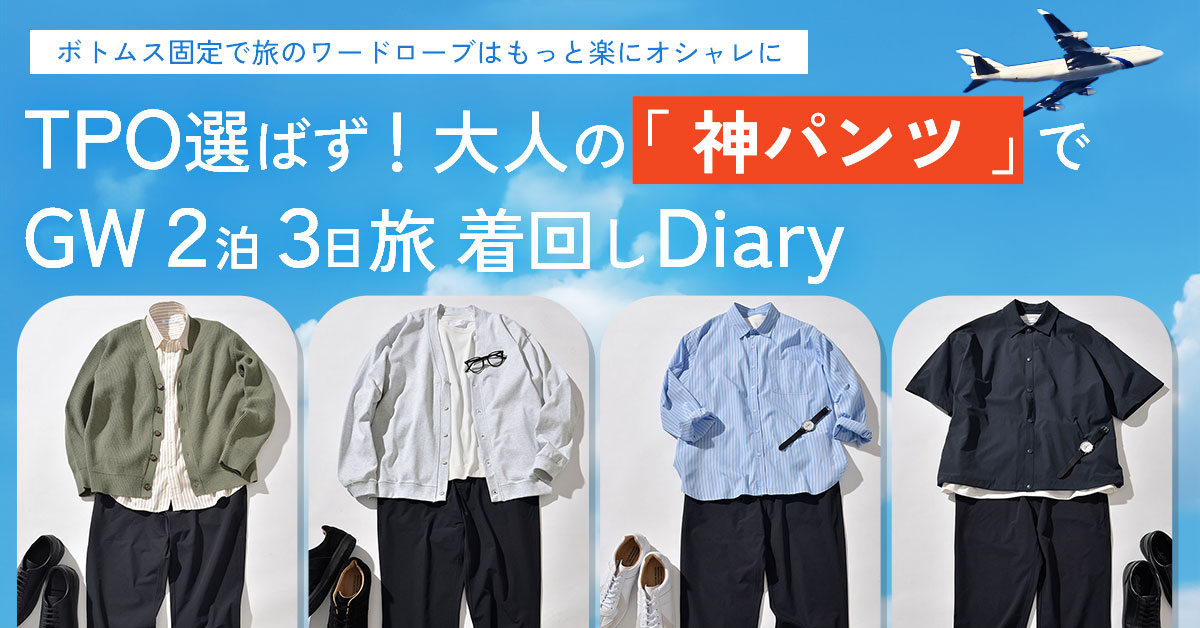 GWの2泊3日旅行。限られたアイテムの中で、いかに”見た目”と”快適さ”を両立させるか。 そこでカギになるのが「着回せるパンツ」です。 今回は1本のボトムスをベースにした3日間の着回しと +1本あると便利な「もう1本」の選び方を紹介します。 旅に持っていくなら、大人の「神パンツ」テックテーパードパンツ1本でキマリ テックテーパードパンツ ナイロン生地なので耐久性がありストレッチ性も持ち合わせているので長時間の移動も何のその。汎用性の高いブラック、そしてスラリとしたシルエットは、どんな旅程にも合う「失敗のない1本」です。 くわしく見る なぜ旅にはテックテーパードがぴったりなのか? 動きやすく、シワになりにくい素材 キレイめにもカジュアルにも振れるデザイン 革靴・スニーカー両方対応のシルエット 人気旅行先別テックテーパード着こなし術 北海道 関東方面 関西方面 沖縄 北海道2泊3日旅行なら・・・ 【気温】 日中の最高気温は15度前後だが、朝晩は冷え込むため防寒対策を! 【注意ポイント】 札幌や小樽は徒歩圏内に観光スポットが点在!歩きやすいスニーカーがベター 札幌・小樽でゆったり美食を楽しむ大人旅コーデ 【札幌で春を感じる街歩き】気温に合わせて脱ぎ着できるのが旅コーデの前提条件 昼間は暖かくても、夕方から急に冷え込んだりするのが春の北海道。調節しやすいカーディガンがあるだけで、街歩きが1日フルで楽しめます。グリーン×ベージュの組み合わせでさりげなく季節感を漂わせて。 OUTERcheck TOPScheck PANTScheck ※SHOESは近日発売予定 【小樽で美食三昧】「楽キチンと」なジャケパンで、ディナーにふさわしい装いを 小樽の落ち着いた街並みに映える、ブラックのセットアップ。佇まいはスマートに、でも着心地は軽やかに。足元は見た目革靴なかっちり見えスニーカーで上品に決めて。 OUTERcheck TOPScheck PANTScheck ※SHOESは近日発売予定 【新千歳空港から帰京】お疲れ様の帰京フライトはストレスフリーなシャツスタイルで 旅行最終日の疲れも、フライトの窮屈さもどんとこい。ゆったりシルエットのノンストレスシャツとラクに穿ける万能パンツで、快適な空の旅をお楽しみください。 OUTERcheck TOPScheck PANTScheck ※SHOESは近日発売予定 関東方面2泊3日旅行なら・・・ 【気温】 日中の最高気温は25度近くになる日も!朝晩はライトアウターを準備して。 【注意ポイント】 “歩く旅”が中心に。坂道や階段の多い観光地もあるので、慣れた靴で向かいましょう。 箱根・鎌倉でアートと歴史を感じる大人旅コーデ 【箱根でアートに触れる】静謐な時間と空間にはあえてのモノトーンコーデが似合う 作品鑑賞を邪魔しない控えめなカラーを”あえて”選択。午前中の、少し残る肌寒さはライトなカーデでカバー。グレー×白×黒の洗練されたワントーンコーデで、旅の始まりを楽しむ。 OUTERcheck TOPScheck PANTScheck SHOEScheck 【鎌倉小町通りを美味散歩】大きめ差し色バッグが地味色コーデのアクセントに ダークカラーのスキッパーニットとブラックのパンツで、まずは着こなしの基盤づくり。明るめベージュのバッグをそこにオンすれば、ハッと目を惹く佇まいに。 TOPScheck INNERcheck PANTScheck SHOEScheck BAGcheck 【海岸沿いをオープンカーでドライブ】ルーズだけどだらしなくない!抜け感がマスト ルーズニットなのにラフすぎない理由は計算されたシルエット。肩のラインをなだらかに見せるラグランスリーブが、ほどよい”抜け感”を演出。ゆるさがありながらも、野暮ったく見えない絶妙バランスの出来上がり。 TOPScheck INNERcheck PANTScheck SHOEScheck GOODScheck 関西方面2泊3日旅行なら・・・ 【気温】 日中の最高気温は25度近くになり、初夏のような暑さに。朝夜の冷え対策にも注意。 【注意ポイント】 坂道や石畳が多いため、フラットなシューズが安心。 大阪・京都でアクティブに過ごす大人旅コーデ 【今話題のグローバルイベントへ】大人の涼しげコーデはネイビー×白で品よく爽やか♡ アクティブに動き回る1日だからこそ、”涼感”は着こなしの必須項目。リネンライクのネイビーニットをメインに、インナーとシューズは白でまとめて。上品さと清潔感、いいとこ取りのサマーコーデ。 TOPScheck INNERcheck PANTScheck SHOEScheck GOODScheck 【道頓堀で粉もんグルメを堪能】今、いつでもどこでも「シャツでリラックス」が新しい! 美味しいものをたっぷり楽しんでも、お腹の出っ張りが気にならない!それはリラックスシャツだからこそ成せる業。手抜きに見えないきちんと感を残すなら、合わせるのはジーンズよりも黒パンツが◎。体型カバーしつつ、スタイリッシュに見せる食べ歩きコーデの新定番。 OUTERcheck TOPScheck PANTScheck SHOEScheck GOODScheck 【京都で歴史探訪そぞろ歩き】白×紺×黒のバランスに秘密あり!の軽やかレイヤード 着ているだけでオシャレに見える白×紺×黒のベーシックカラー。そこに知的さを加えるには色のバランスとこなれ感が重要。レイヤードの仕方、袖のまくり方ひとつで