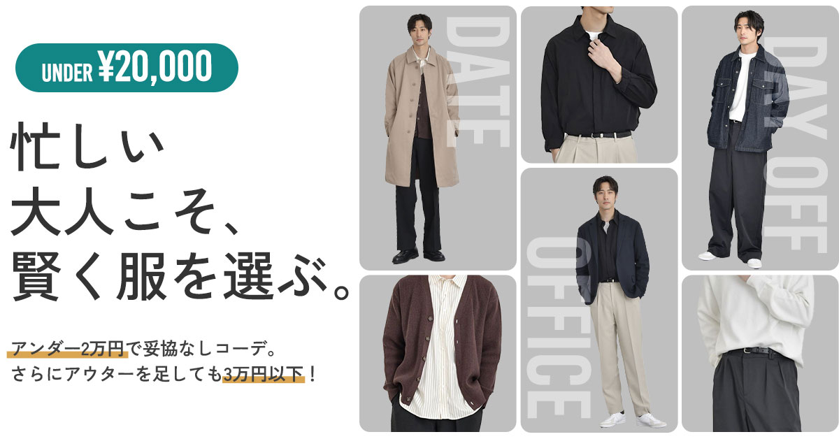 新しい春服を一気に揃えたいけれど、気になるのはやっぱり予算。そこで今回は『2万円以下で揃う、春の全身コーデ』をご紹介。アウターを加えても3万円以下なので、気温差の多い春でも安心!コスパと上質感を両立する大人の装いを見つけてみませんか? シーン別にコーディネートをCHECK! デートDate オフィスOffice 休日Day off デートDate UNDER¥20,000- コーデ カフェやレストランでのデートはもちろん、落ち着いた街歩きにもピッタリ!派手すぎず、それでいて「こなれ感」をしっかり演出した、大人の余裕を感じさせるコーディネート。 CARDIGAN ¥5,490 Check SHIRT ¥5,990 Check PANTS ¥6,490 Check TOTAL ¥17,970 tax in +OUTER コーデ ベージュのステンカラーコートを加えることで、より上品かつ春らしさをプラス。アウターを足しても3万円以下で、天候や気温差を気にせずデートを楽しめるのが嬉しいポイントです。 COAT ¥9,990 Check CARDIGAN ¥5,490 Check SHIRT ¥5,990 Check PANTS ¥6,490 Check TOTAL ¥27,960 tax in オフィスOffice UNDER¥20,000- コーデ シャツとロンTをレイヤードすることで、適度にカジュアルダウン。ベージュのテーパードパンツが柔らかい雰囲気をプラスし、オフィスにふさわしい落ち着きを演出。2万円以下でも妥協のない大人のビジネススタイルが完成です。 SHIRT ¥5,990 Check TOPS ¥2,490 Check PANTS ¥6,990 Check BELT ¥2,490 Check TOTAL ¥17,960 tax in +OUTER コーデ ネイビーのテーラードジャケットは、ビジネスシーンに欠かせない定番アイテム。ベージュのテーパードパンツとの配色がやさしい印象を作り、余裕ある大人のオフィススタイルを実現。シンプルながらもきちんと見えする着回しを気軽に楽しめます。 JACKET ¥10,990 Check SHIRT ¥5,990 Check TOPS ¥2,490 Check PANTS ¥6,990 Check BELT ¥2,490 Check TOTAL ¥28,950 tax in 休日Day off UNDER¥20,000- コーデ スウェットライクニットと、ゆとりのあるワイドバルーンパンツで、休日ならではのリラックススタイルが完成。スミクロのシックな色味が大人っぽさを引き立てつつ、ナローリアルレザーベルトでさりげなく引き締めるのがポイント。 KNIT ¥5,990 Check PANTS ¥6,990 Check BELT ¥5,990 Check TOTAL ¥18,970 tax in +OUTER コーデ ゆるめスタイルにデニムシャツジャケットをプラスすると、ほどよいきちんと感と季節感がアップ。インディゴの深みあるカラーが、ホワイトのニット&スミクロのパンツと相性抜群。気温差にも柔軟に対応できる大人の余裕ある着こなしが手軽に楽しめます。 JACKET ¥8,990 Check KNIT ¥5,990 Check PANTS ¥6,990 Check BELT ¥5,990 Check TOTAL ¥27,960 tax in 足元まで抜かりなく。オススメシューズ キレイめにはコレ Uチップシューズ 汎用性抜群 コートレザースニーカー ※表示価格は予告なく変動する場合がございます。