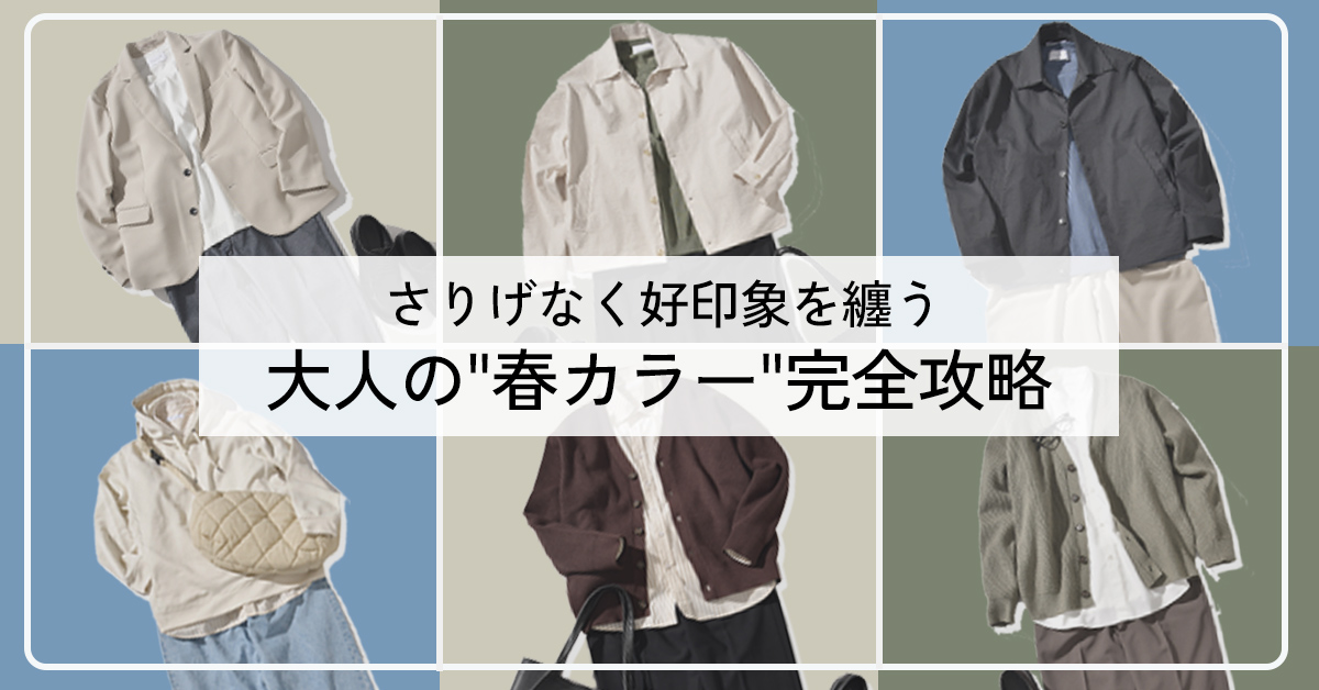 気温が20℃を超え、すっかり春の陽気になった今日この頃。 好印象な服装に迷うなら、季節感の出る「春カラー」を使うのが手っ取り早い! 大人の男性が着こなしやすい”春カラーコーデ”をご紹介いたします。 INDEX 春カラーを取り入れるメリットとは? 大人に似合う 春カラーコーデ 春カラーアイテムまとめ 春カラーを取り入れるメリットとは? 30代以上の男性が着こなしに“春カラー”を取り入れることには 見た目の印象や心理的な面で多くのメリットがあります。 若々しく見える 明るめの色が清潔感を演出し、軽やかなスタイルに。ビジネスやプライベートでも好印象を与えます。 季節感の演出 季節を意識した色選びをしていると、それだけで「服に気を配れる人」「自分を知っている大人」という好印象に。 女性からの印象アップ 落ち着いたトーンに慣れている大人こそ、淡い色を自然に着こなせるとギャップによる好感度がアップ! 大人に似合う 春カラーコーデ メリットが分かっても、実際の着こなしに取り入れるにはハードルが高い…。 そんなあなたでも自然に着こなせる春カラーがこちらです。早速それぞれのコーディネートを見ていきましょう。 上品で柔らかなベージュ さわやかで知的ブルー 自然で落ち着いたグリーン 春カラー別コーディネート 上品で柔らかな印象ベージュ さわやかで知的な印象ブルー 自然で落ち着いた印象グリーン ベージュはこう着こなす 好印象ポイント 上品でナチュラルなベージュは、年齢を重ねた男性の落ち着いた魅力を引き立てます。 柔らかな印象を持つカラーなので、「優しげな男性」を演出できますよ。 コーディネート 軽やかなベージュのジャケットが春らしさを演出。柔らかさと上品さが大人の余裕を感じさせます。 トレンドのブラウンと合わせて優しげな印象に。ストライプ柄がコーデのアクセントになっています。 ベージュのパンツが程よい抜け感をプラス。暗めトップスとも好相性で、春らしい軽快さを演出。 使用した春カラーアイテム シャツジャケットナチュラル アイテムをみる テーラードジャケットアーシーベージュ アイテムをみる ストライプシャツベージュ アイテムをみる テーパードパンツアーシーベージュ アイテムをみる ブルーはこう着こなす 好印象ポイント 清潔感と爽やかさをイメージさせ、オンでもオフでも取り入れやすいブルー。 知的な印象もあるため「頼れる男性」を演出することもできます。 コーディネート デニムジャケットのインディゴカラーが春らしく、カジュアルながらも大人のこなれ感を演出してくれます。 鮮やかなブルーのインナーが着こなしに彩りを加え、シンプルな装いに春らしい軽やかさを添えてくれます。 ブルーのデニムパンツが春の装いに程よいラフさをプラス。ふらりと街歩きにちょうどいい着こなしです。 使用した春カラーアイテム デニムシャツインディゴ アイテムをみる デニムシャツジャケットワンウォッシュ アイテムをみる ルーズシルエットニットブルー アイテムをみる デニムパンツインディゴ アイテムをみる グリーンはこう着こなす 好印象ポイント 穏やかな印象を与える色で、特にオフの日のリラックスコーデにおすすめ。 主張しすぎないグリーンは親近感を持ってもらうのにも有効です。 コーディネート 深みのあるグリーンのカーディガンが大人の落ち着きを演出。ブラウンのパンツと合わせてナチュラルな装いに。 鮮やかすぎないグリーンのニットがほどよいアクセントに。春らしい軽快さと大人の品を両立した着こなしです。 カーキのインナーがコーデ全体を引き締め。落ち着いた大人カジュアルが完成しますよ。 使用した春カラーアイテム ロングTシャツスモーキーグリーン アイテムをみる カーディガンセージグリーン アイテムをみる ルーズシルエットニットアーミーグリーン アイテムをみる ニットタンクトップカーキ アイテムをみる 春カラーアイテムまとめ more more more more more more more more more more more more