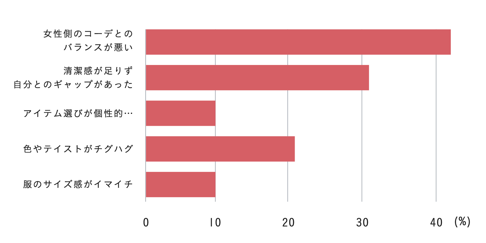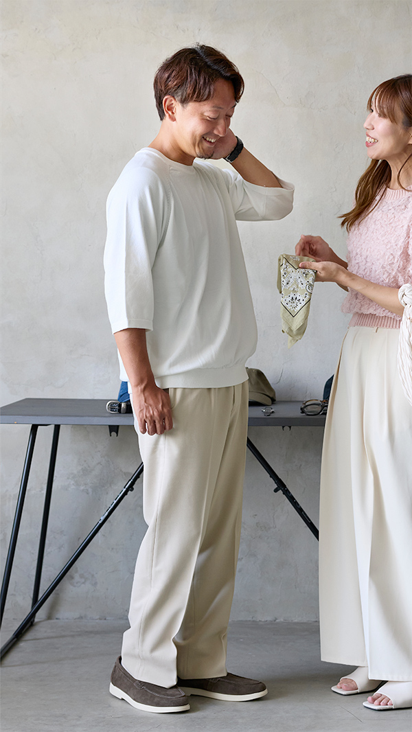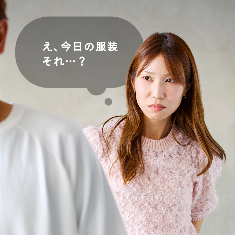 デート前の服装、女性ってどう見てる? デートの日、何気なく選んだその服。 実は女性は、ちょっとモヤッとしてるかも? 付き合いが浅くても長くても、女性は意外と「パートナーの服装」にこだわりを持っているものです。 デート前に、パートナーの服装のどんな部分が気になりましたか? ちょっとお高めのランチだったのに、彼だけ全身カジュアルで浮いていたんだよね…。私だけ気合い入れたみたいになっちゃった。 休日っぽいラフな格好の私に対して、彼の服が仕事帰りみたいで違和感…。ショッピングデートで歩き回ろうと思ってたんだけどな。 いつだって悩ましいデート服。 「その服装、イイじゃん!」と褒められたいなら、“女性のファッションに合わせる”のが最短ルートです! 今回は女性の服装タイプ別に、あなたの印象がグンとアップする「ほめられデート服」を紹介していきます。 あなたのパートナーはどのタイプで、どんな服装が好きなのでしょうか? 今回の主役アイテムはこちら! CODE テーパード color:ブラック CHECK ルーズシルエットニット color:オフホワイト CHECK CODE ワイドパンツ color:ネイビー CHECK 女性の服装タイプ別 “あなたに求めるオシャレ像”分析 モテる服より、“彼女に刺さる服”。それがデート服の正解です。 清潔感がある、年齢相応… それだけじゃ、実は不十分。 女性が「今日の服、いいね」と感じるかどうかは、自分の服装との“相性”が大きく影響します。 だからこそ、彼女のファッションタイプに合わせた服選びがカギ。 このセクションでは、女性の服装タイプ別に「あなたに求めるオシャレ像」を紹介します。 キレイめタイプ キュートタイプ アクティブタイプ キレイめタイプ Dress Type 服装のタイプ 「きちんと感+女性らしさ」が軸の上品なスタイル。色使いは落ち着いており、ベーシックカラー(モノトーンやネイビー・ベージュ)を基調とします。 ブラウスやキレイめニット、センタープレスパンツ、ミディ丈スカートなどが代表的。 男性に求める服装は? 清潔感があり整った大人っぽいスタイルを好む傾向。オーバーサイズすぎず体型に合ったシルエットで、原色や派手なプリントは控えめに。 TPOをわきまえ、お店やレストランの雰囲気に合う服装を求めます。 キレイめタイプの好きコーデ・イマイチコーデ 好きコーデ イマイチコーデ ラフすぎたり派手すぎる格好はちょっと子どもっぽく見えて苦手かも。シンプルで清潔感のある大人っぽい服装ってやっぱり素敵だなって思います。 まずはコレだけ! “キレイめタイプ”好感度アイテム CODE テーパード color:ブラック 落ち着いた色使いと上品なシルエットが、キレイめタイプと好相性。 ブラックのテーパードスラックスなら、知的さと大人の余裕を自然に演出できます。 CHECK キュートタイプ Cute Type 服装のタイプ 「可愛らしさや柔らかさ」を強調したスタイル。色使いは明るく華やかで、レースや小花柄などデザインに可愛げのあるものが多いです。 丸襟やパフスリーブのトップス、Aラインスカートやフレアスカートが特徴的。 男性に求める服装は? 優しそうで親しみやすい、だらしなくない服装を好む傾向。白、ベージュ、ライトグレーなどの淡いカラーで、程よくゆるいシルエットが好ましいです。 大人っぽさやカッチリ感より、柔らかい雰囲気や清潔感を重視し、一緒にいて落ち着ける感じを求めます。 キュートタイプの好きコーデ・イマイチコーデ 好きコーデ イマイチコーデ ワイルドすぎたりゴツめの服装だと、ちょっと近寄りづらく感じちゃいます。だからこそ、やわらかい色味や優しい雰囲気のカジュアルできれいめなスタイルが好きですね。 まずはコレだけ! “キュートタイプ”好感度アイテム ルーズシルエットニット color:オフホワイト 淡い色合いの柔らかなニットが、キュートタイプの華やかな装いにマッチ。 適度な落ち感が、肩ひじ張らない親しみやすさを引き立ててくれます。 CHECK アクティブタイプ Active Type 服装のタイプ リラックス感や動きやすさを重視した、ラフで親しみやすいスタイル。トレンド感や抜け感を取り入れ、ゆったりめやオーバーサイズのシルエットが多いです。 スカートよりパンツコーデを好み、メンズライクなアイテムも着こなします。 男性に求める服装は? ベーシックやアースカラーを基調に、小物を上手く使ってアクセントを。動きやすさを考えた余裕のあるシルエットで、自然体ながらもきちんと感をキープ。 Tシャツやワイドパンツなどカジュアルアイテムを軸にしたラフで清潔な装いが好まれます。 アクティブタイプの好きコーデ・イマイチコーデ 好きコーデ イマイチコーデ キレイめすぎる服装だと、ちょっと堅苦しく感じちゃいます。逆に、ラフで動きやすいカジュアルなスタイルの男性は、一緒にいて楽しいし安心感があります。 まずはコレだけ! “アクティブタイプ”好感度アイテム CODE ワイドパンツ color:ネイビー 動きやすく清潔感のあるネイビーのワ