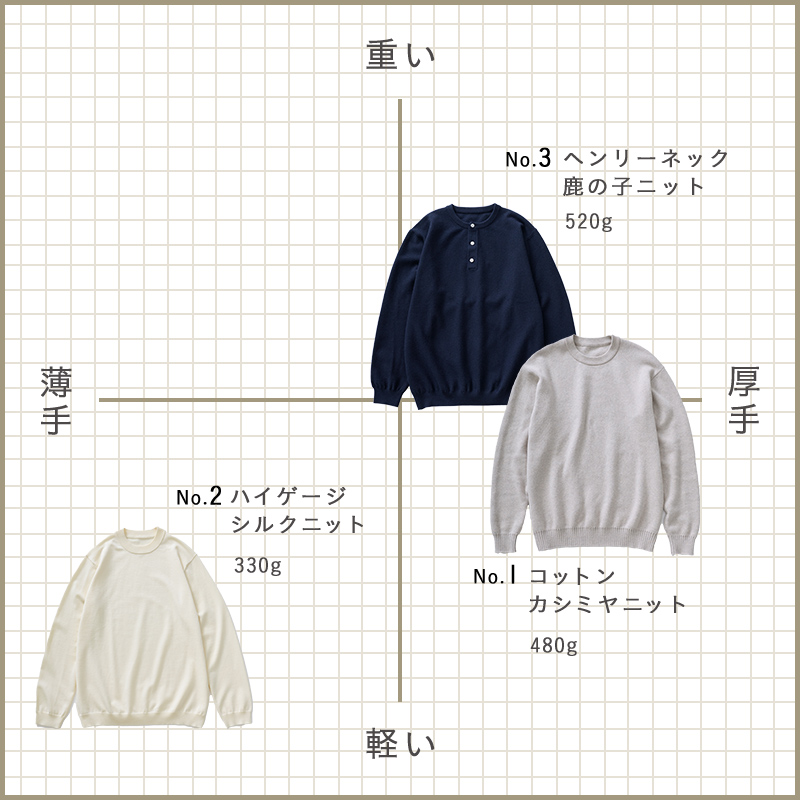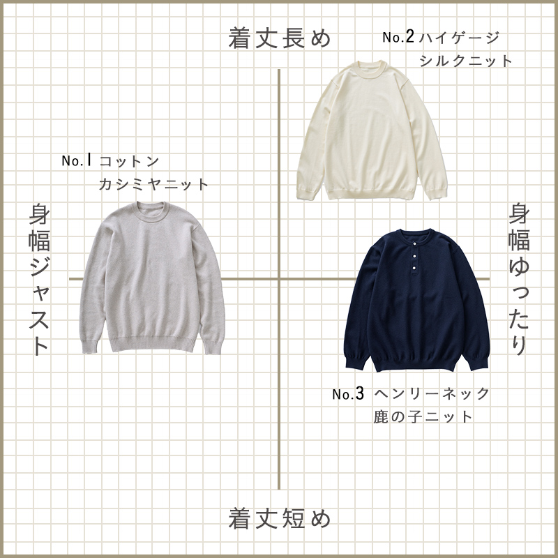 まだヘビーアウターを着る季節ではない今、主役になるのはやっぱりニット。 今季のAUENはニットが豊作で、どれを選ぶか迷ってしまう人も多いはず。 そこで編集部がイチオシニットを3つ選抜! あなたに合う一枚はどれか、徹底的に深掘りしていきます。 INDEX この秋冬、大活躍必至AUENニットの3大巨頭 迷ったらまずはコレ3大ニットを使ったイチオシコーデ 【チャートで深堀り】3大ニットの気になるアレコレ この秋冬、大活躍必至AUENニットの3大巨頭 肌触り重視なら キレイめに仕上げるなら 脱・定番を狙うなら カシミヤの柔らかさをデイリーに コットンカシミヤクルーネックニット check カシミヤ素材を使用し、なめらかなスムース編みに仕立てることで、ふんわりやわらかな肌触りに。マシンウォッシャブル仕様で、上質な着心地を気兼ねなくデイリーに楽しめます。 こんな人におすすめ 着心地重視でストレスなく過ごしたい 上質さをさりげなく取り入れたい 手入れの手間を減らしたい 上品見えするドレッシーな1枚 ハイゲージシルクニット check シルク・テンセル・ウールをブレンドした光沢感のある生地で、大人の男性にふさわしい上品さを演出。キレイめなテーパードパンツとの相性も抜群で、オンオフ問わず秋冬春と活躍します。 こんな人におすすめ 上品な印象で着こなしたい 普段着だけでなく、オフィスでも使用したい 季節を問わず着回せるニットがほしい 無地と差がつくアクセントニット ヘンリーネック鹿の子ニット check 表面に凹凸のある鹿の子編みやヘンリーネック、白蝶釦などのさりげないディテールが特徴。休日のカジュアルスタイルはもちろん、ジャケットのインナーとしても活躍する、表情豊かなニットです。 こんな人におすすめ 派手すぎずに、着こなしに変化を出したい さりげない個性を取り入れたい カジュアル寄りのアイテムも好み ひと目でチェック 3大ニット比較表 コットンカシミヤ クルーネックニット 価格 6,990 素材 綿93%,カシミヤ7% カラー グレージュ,チャコール,バーガンディ,ネイビー サイズ S,M,L,XL ケア 洗濯OK(ネット使用) check ハイゲージシルクニット 価格 6,990 素材 再生繊維(セルロース)41%,ポリエステル30%,アクリル25%,シルク3%,毛1% カラー ホワイト,ブラック,ブルーグレー サイズ S,M,L,XL ケア 洗濯OK(ネット使用) check ヘンリーネック鹿の子ニット 価格 6,990 素材 ポリエステル30%,アクリル27%,レーヨン23%,ナイロン20% カラー ネイビー,カーキブラウン サイズ S,M,L,XL ケア 洗濯OK(ネット使用) check 迷ったらまずはコレ3大ニットを使ったイチオシコーデ コットンカシミヤクルーネックニット ふんわり好感度ニットでつくる大人の街歩きデートスタイル check check コットンカシミヤを使用した滑らかな質感のニットは、着るだけで優しい印象を与え、好感度の高いスタイルに。ワイドパンツを合わせた今っぽい着こなしは、カフェ巡りや都内での街歩きデートにもぴったりです。 ハイゲージシルクニット インナーに仕込む”きちんとホワイト”でオフィスでの印象アップ check check check 上品で温かみのあるホワイトのニットは、いつものオフィカジスタイルを格上げ。シンプルな装いながらも、柔らかな色味が顔周りを明るく見せ、きちんとしているのに堅すぎない雰囲気に仕上げています。 ヘンリーネック鹿の子ニット 首元ボタンがアクセント休日パパスタイルを手軽に差別化 check check check 週末、家族とのお出かけに最適なリラックスニットスタイル。首元のボタンがワンポイントアクセントとなり、ベーシックなチノパンでも簡単に差別化コーデを楽しめます。 【チャートで深堀り】3大ニットの気になるアレコレ 重さを比較すると? サイズ感を比較すると? ニットの重さを比較すると? No.1 コットンカシミヤニット ミディアムウェイトで扱いやすい重さ。適度な厚みと心地よいふんわり感は、これからの季節にベストマッチ。 No.2 ハイゲージシルクニット 3ニットの中でも断トツの軽さ。やや薄手なので秋や春に使いやすく、冬もダウンの下はこれくらいが◎ No.3 ヘンリーネック鹿の子ニット 3ニットの中では最も重量あり。かといってズシンという重さではなく、程よい厚みで日常使いしやすいです。 ニットの重さを比較すると? 軽め check 中間 check 重め check ニットのサイズ感を比較すると? 168cm / 64kg通常Mサイズのスタッフで比較 正面比較 No.1 No.2 No.3 サイド比較 No.1 No.2 No.3 No.1 コットンカシミヤニット 着ぶくれしないようこだわったレギュラーシルエット。サイドスリットがさりげないこなれ感を演出します。 No.2 ハイゲージシルクニット やや着丈長めの伸縮性のあるニットで、窮屈感のない着心地。お客様の声を反映し、前モデルよりも首元の締めつけを軽減しました。 No.3 ヘンリーネック鹿の子ニット ちょうどいいゆとりのある身幅で、一枚で着てもサマになります。ジャケット合わせでも違和感のない着丈も絶妙。 ニットのサイズ感を比較すると? ジャスト check 中間 check ゆったり check 