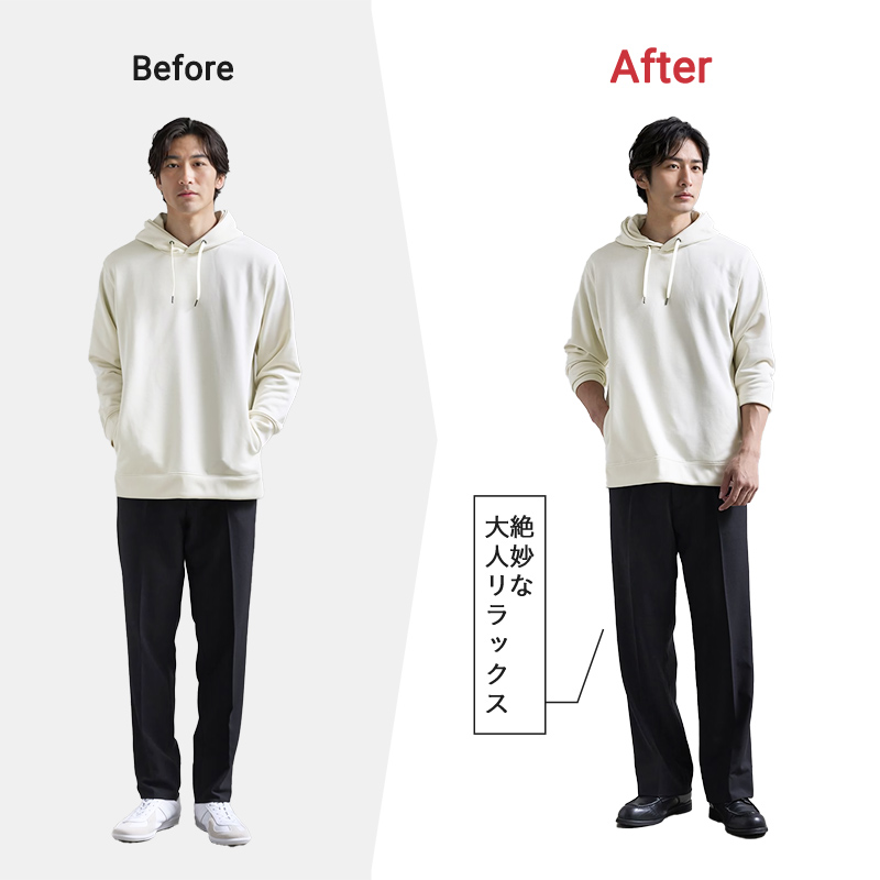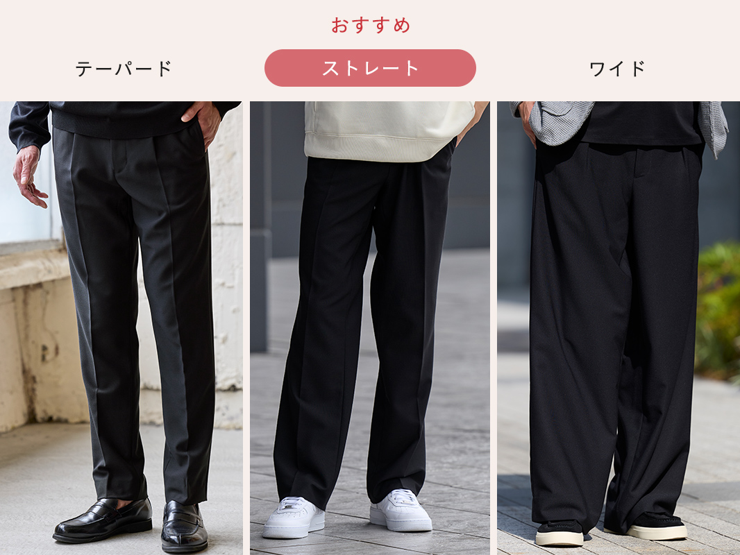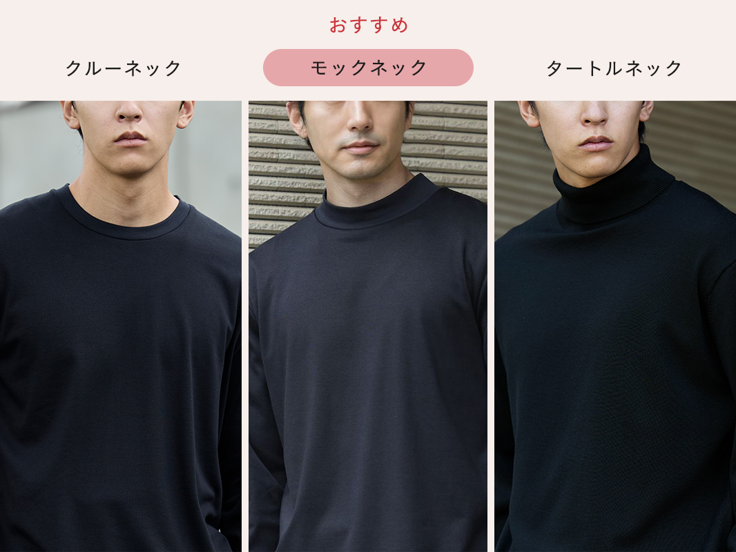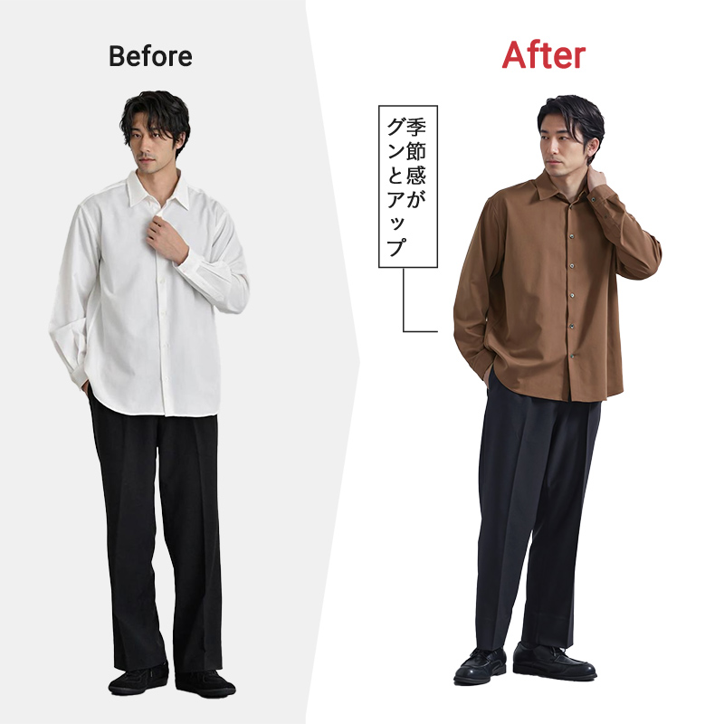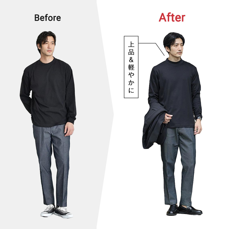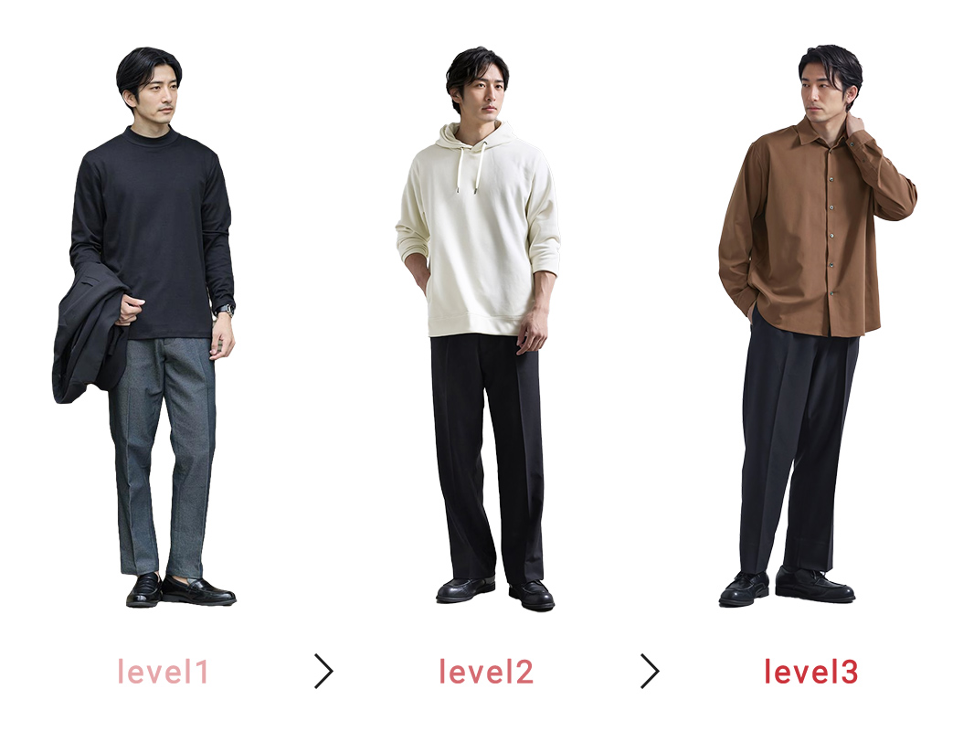 涼しさを感じる日が増え、そろそろ服装も晩夏から秋にスイッチしていきたい時期。 けれど「クローゼットはいつも同じ」で、何から変えたらいいか分からない… そんな人にこそおすすめなのが“ワンクッションアイテム”。 この特集では、あなたの「服装アップデートレベル」をチェックしながら、ちょうどいい秋の1枚をご提案します。 ワンクッションアイテムとは いつもの服装から大きく外れずに、少しだけ変化を加えられるアイテムのこと。 普段の着こなしにさりげない新鮮さをくれて 気分を前向きにしてくれる“オシャレの後押し役”のような存在です。 この特集で紹介するワンクッションアイテムはこちら check check check Section 01 チェック診断 あなたの「服装アップデートレベル」はどのくらい? この秋、ちょっと新しい服に挑戦したい気持ちはあるけれど、どこから変えたらいいか分からない…。 そんなときは、まず自分の「服装アップデートレベル」をチェック! 今の気分に合った一歩目を見つけてみましょう。 0 / 5 チェック 服装が変わると気分も変わると思う 「いつも同じような服だな」と感じることがある 周りに「雰囲気変わったね」と言われたい 新しい色や形の服を見ると気になる 無難よりも、少し工夫された服に惹かれる あなたの服装アップデートレベルは? 0~1 安心スタート派 2~3 ちょっと冒険派 4~5 前向きチャレンジ派 Section 02 アップデートレベル別 ワンクッションアイテムを伝授 診断で分かったあなたの「服装アップデートレベル」に合わせて、この秋に取り入れたいワンクッションアイテムをご紹介します。 レベル別だからこそ、背伸びしすぎず“ちょうどいい変化”が見つかるはず。 さっそく自分に合ったアイテムをチェックしてみましょう。 あなたの服装アップデートレベルは? 0~1 ほんの少しの変化から! 安心スタート派 2~3 無理なくこなれ感をプラス ちょっと冒険派 4~5 見た目の印象を変えたい 前向きチャレンジ派 level 01 「ネックラインを変えてみる」 安心スタート派 0~1 ハイゲージ長袖カットソー モックネックブラック いつもとほんの少し雰囲気を変えたい安心スタート派は、まずはトップスのネックラインに注目。 おすすめなのが、クルーネックの延長で取り入れやすいモックネックTです。 check ワンクッションポイント クルーネック 首元が開放的で最もリラックス感の強い印象 モックネック 首をほどよく隠すことで、キレイめさを出しつつ軽やかにきまる タートルネック 首全体を覆うため、エレガントでフォーマル寄り モックネックは、クルーネックよりきれいめで上品に見えつつ、タートルネックほど堅苦しくない絶妙なバランスで、 大人の普段着に取り入れやすいワンクッションアイテムです。 ワンクッションアイテムで ステップアップコーデ モックネックなら”上品見え”に振るが勝ち! シックに魅せる、秋のドレッシーコーデ Afterコーデ使用アイテム check check check モックネックを着るなら、その上品さを活かしたキレイめコーデがおすすめ。 すっきりとしたスラックスと革靴の組み合わせが、清潔感をより引き立てて素敵です。 ジャケット合わせでもサマになるので、デートや会食シーンにもマッチしますよ。 シャツ好きにもおすすめ! 挑戦しやすいネックラインアイテム check check シャツ派のあなたも試しやすいネックラインがこちら。 襟を省いたすっきり感が魅力のバンドカラーや、 胸元がほどよく開いた抜け感のあるスキッパーシャツなら いつものシャツスタイルも一味違って見せられます。 level 02 「パンツのシルエットを変えてみる」 ちょっと冒険派 2~3 CODEストレートパンツ ブラック ガラッとではないけど印象を変えたい“ちょっと冒険派”は、パンツチェンジでシルエットを刷新! いつもの細身パンツからの脱却なら、ややゆとりを持ったストレートパンツがおすすめです。 check ワンクッションポイント テーパード スッキリ&脚長。ビジネス寄りでも使える「キレイめ型」 ストレート ややゆとりがあり体型を拾わない。シーンレスで使える「ベーシック型」 ワイド リラックス感や抜け感◎ 休日やオフスタイルに使いたい「トレンド型」 ストレートパンツなら、テーパードのすっきり感とワイドのゆとりを両立し、 自然体でありながら品よく見える“大人のバランスシルエット”が叶います。 ワンクッションアイテムで ステップアップコーデ 細身パンツからシルエットチェンジで マンネリパーカーコーデを即アプデ Afterコーデ使用アイテム check check check カジュアル度合いが難しいパーカーコーデは、ストレートパンツ合わせが◎ 野暮ったさはないのにどこか余裕を感じるシルエットがカッコいいです。 パンツとシューズの色を合わせれば、脚をスラリと長く見せる効果も。 無理せず雰囲気を変えられる スタイルチェンジにちょうどいいパンツ check check 細身すぎないシルエットに変えるならこちらもおすすめ。 ほどよくラフさを演出できるストレ