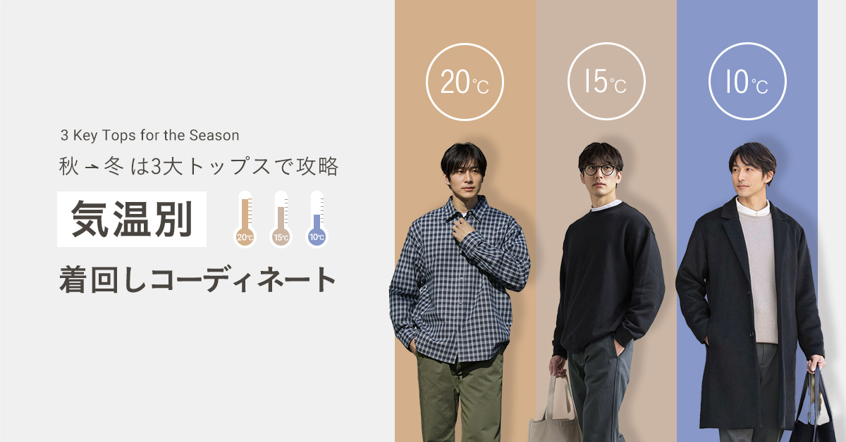 気温に振り回されない着こなしのコツ教えます 秋から冬の切り替え時期は気温の変化が激しく、服選びが難しい季節。 しかし、トップスを上手に着回すことで20℃~10℃まで対応することができます。 着こなしのコツを学んで、賢く着回ししませんか? 秋冬の3大トップス まずは、秋から冬に切り替わる時期に活躍してくれる「3大トップス」をご紹介。着回しの効く、使い勝手の良いトップスを厳選しました。 毎日着たくなる上質な肌ざわり コットンカシミヤニット コットン×カシミヤが、やさしくなめらかな着心地の良さを実現。洗濯機で洗えるのも嬉しいポイント。 商品を見る 秋冬らしいダークカラーが魅力 チェックネルシャツ 大人が気軽に楽しめるシンプルなチェックネルシャツ。落ち着いたカラバリで、カジュアル過ぎない着こなしに。 商品を見る 上品見えするカジュアルトップス コットントレーナー 定番だからこそ、品質にこだわった国産トレーナー。耐久性もあり、トレンドにも左右されないため、長く使える一着。 商品を見る 3大トップスでつくる気温別コーディネート 3大トップスを使用した10℃・15℃・20℃の気温別コーディネートをご紹介。着こなしポイントと合わせて解説していきます。ぜひ参考にしてみてください。 気温別着こなしポイント 最高気温 20℃ 秋冬カラーで季節感を取り入れる 最高気温 15℃ 色合わせと重ね着を上手く活用する 最高気温 10℃ 防寒対策も着ぶくれ対策も忘れない 3大トップスでつくる 最高気温20℃のコーディネート 着こなしポイント 秋冬カラーで季節感を取り入れる 最高気温20℃の場合、まだトップス一枚でも過ごせるため、色選びがとても重要。最も簡単な方法として、秋冬カラーを取り入れることをおすすめします。それだけで、季節感のある着こなしにグッと近づきますよ。 Burgundy×Black 深みのあるバーガンディが、シャープな印象の黒にぬくもりを与えてくれます。 落ち着きと華やかさを兼ね備えた、秋冬らしい上品な組み合わせ。 Black×Gray 無彩色のグラデーションが、クールな印象を演出。 知的ながらも品格があり、どんなシーンでもなじむ万能配色です。 Navy×Khaki 品のあるネイビーにカーキの柔らかさが加わり、程よく抜け感のある印象に。 清潔感と親しみやすさを両立した、秋冬におすすめの有彩色合わせ。 No.1 コットンカシミヤニット 秋冬カラーを楽しむならバーガンディニットを主役に 最高気温20℃なら、重ね着いらずでニット1枚を主役に。厚手すぎない、深みのあるバーガンディのニットで季節感を取り入れれば、秋冬らしい装いに仕上がります。 使用アイテム knit 商品を見る pants 商品を見る shoes 商品を見る sunglasses 商品を見る belt 商品を見る socks 商品を見る No.2 チェックネルシャツ 気取らないデートコーデにはチェックシャツで抜け感を 日中はシャツ1枚でもOK。ゆったり着られるチェックシャツなら、ほどよい抜け感を楽しめます。ネイビー×カーキの組み合わせはアクティブな印象で、街歩きのデートにもピッタリ。 使用アイテム cutsew 商品を見る shirt 商品を見る pants 商品を見る belt 商品を見る socks 商品を見る watch 商品を見る No.3 コットントレーナー 大人の休日スタイルはモノトーンでまとめる ふらっとお出かけしやすい季節には、トレーナーがちょうどいい。ブラックとチャコールのパンツでグラデーションをつくれば、洗練されたモノトーンコーデが完成します。 使用アイテム sweatshirt 商品を見る pants 商品を見る shoes 商品を見る belt 商品を見る socks 商品を見る 3大トップスでつくる 最高気温15℃のコーディネート 着こなしポイント 色のトーンと重ね着を上手く活用する 15℃になるとアウターを着用したり、インナーを着込んだりと、組み合わせるアイテム数が増えます。そのため、着こなしがまとまる色使いや、重ね着のポイントを理解しておくことが大切です。 1色のトーンを揃える 同系色でまとめると、統一感が出て、大人っぽい印象に。秋冬は、こちらの3つのパターンが特におすすめです。 2計算された”チラ見せ”設計 シャツの襟や、Tシャツの裾・袖口を1~2cmだけ見せると効果的。やり過ぎは禁物。さりげなく上品に着こなすことがポイントです。 首元から”チラ見せ” 裾から”チラ見せ” No.1 コットンカシミヤニット 色のトーン合わせなら”ブラウンに頼る”が正解 色を取り入れた着こなしに挑戦するなら、秋冬の代表カラー”ブラウン”から始めましょう。温かみと落ち着きのある雰囲気で好印象間違いなし。深みブラウンならセットアップもおすすめです。 使用アイテム knit 商品を見る jacket 商品を見る pants 商品を見る No.2 チェックネルシャツ 冬のオフィカジはチェックシャツをポイントに いつものオフィスコーデも、インナーをチェックシャツに替えるだけでぐっとこなれた印象に。同系色のグレーのカーディガンを重ねれば、トーンがまとまり、ビジネスシーンでも馴染みます。 使用アイテム cutsew 商品を見る sh
