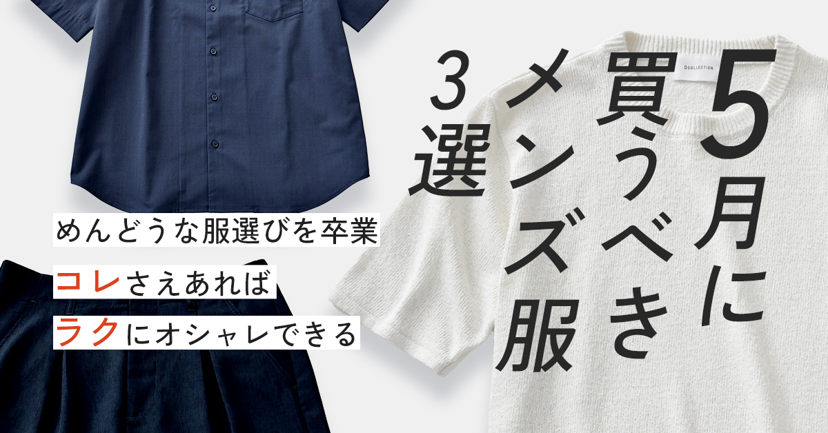 暑くなってきたし、新しい服が欲しい。 でも、 「夏服は早い気がする」 「流行も気になるけど、調べるのが面倒」 「長く使える服が欲しいけど、 どれが良いか分からない」 そんな“ちょっとした悩み”が積み重なって、 結局去年の服を着まわしたりしていませんか? 少しでもその面倒がなくなるように、 この5月に買うべき、 “考えなくてもキマる、ちょうどいい服” を、3つだけご提案します。 今年のトレンドを押さえた、スタイリスト推奨コーデもご覧ください。 これだけ押さえればOK5月に買うべき服3選 今から夏本番までずっと使える サマーニット check プラスワンの最適解 オープンカラーシャツ check 梅雨も夏もコレ一本 サマーワイドパンツ check ニット シャツ ワイドパンツ No.1 今から夏本番までずっと使える テクスチャーサマーニット 朝夜の肌寒さは残りますが、5月に買うべきトップスは半袖です。 Tシャツに頼りきりがちな季節ですが、 今年はサマーニットへの挑戦をおすすめします。 リネンのような表面をした素材感は、 1枚でもサマになり、こなれた印象を作り、 いつもとは違う雰囲気を楽しめます。 カラーアイボリー/ネイビー/ブラック/ライトグリーン ニットをくわしくみる こんな人にオススメ 夏はTシャツばかりになる方 1枚で着こなせるトップスが欲しい方 リラックス感のある服が欲しい方 今年はこう着る!スタイリスト推奨コーデ 爽やかさと清潔感を兼ね備えたアイボリー。男らしくドシッと構えるならワイドパンツがおすすめ。抜け感も夏らしさもこれ一本で整います。 more more 深みのあるネイビーが夏らしさと男らしさを両立。女性人気の高いナチュラルカラーのパンツを合わせれば、女子ウケコーデが完成します。 more more シックに決めるならブラック。キリッとした表情が、頼りがいのある男に仕上げます。重たい印象はでるので、明るめのアイテムでバランスを整えて。 more more ニットをくわしくみる No.2 プラスワンの最適解 オープンカラーシャツ トップス1枚だと物足りなさを感じる。 そんな方のプラスワンアイテムの 最適解が、オープンカラーシャツ。 一般的にはパジャマのような襟が 特徴的ですが、 レギュラーカラーの良さも取り入れた、 他にはない新しいスタイルのシャツです。 カラーナイトブルー/ナチュラル/スミクロ/ライム シャツをくわしくみる こんな人にオススメ コーデにマンネリを感じる方 涼しい羽織りが欲しい方 他の人とは被りたくない方 今年はこう着る!スタイリスト推奨コーデ 「あまり派手な色は使いたくない」こんな想いに最適なコーデ。暗めなトーンですが、オーシャンカラーのおかげで、暑苦しくない印象に仕上がります。 more more more モノトーンでまとめたコーデは、いつでも安定。ナチュラルカラーなので、コントラストが和らぎ、こなれた雰囲気にまとまります。 more more more トレンドを匂わすライムカラーをチョイス。ベーシックではないカラーで楽しめるのも夏の魅力です。周りと差別化したコーデもたまには。 more more more シャツをくわしくみる No.3 梅雨も夏もコレ一本 サマーワイドパンツ 汗ばむ季節に最適解なのは、肌に密着しないワイドパンツ。 リネンのような風合いの素材感で、 ベタつきからはおさらばです。 これからの季節なら、抜け感のあるワイドパンツがおすすめ。 太すぎないシルエットに調整したので、 初めての方でも挑戦しやすいのが魅力です。 カラーネイビー/チャコール/ベージュ パンツをくわしくみる こんな人にオススメ 細身パンツしか持っていない方 ゆったり系のコーデが好きな方 キレイめと快適さを両立させたい方 今年はこう着る!スタイリスト推奨コーデ 以前の社内アンケートで女性から大人気だったベージュ系パンツ。ハードルが高いと感じるもしれませんが、このカラーを着こなせばオシャレの幅はグッと広がります。 more more more 朝晩の若干の冷え込みにピッタリなロンTコーデ。モカカラーのカジュアルさを、ネイビーがグッと引き締め、バランスの取れた仕上がりに。 more more 大人の渋さを表現するチャコールカラー。リラックス感のあるシャツを合わせて、抜け感を出せば、こなれた雰囲気に。 more more パンツをくわしくみる 今回紹介したアイテム 今から夏本番までずっと使える サマーニット more プラスワンの最適解 オープンカラーシャツ more 梅雨も夏もコレ一本 サマーワイドパンツ more