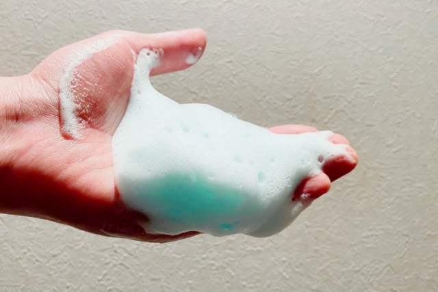 ぬるま湯で予洗いが終わったら、頭皮への摩擦ダメージを軽減するためにシャンプーをよく泡立てます。