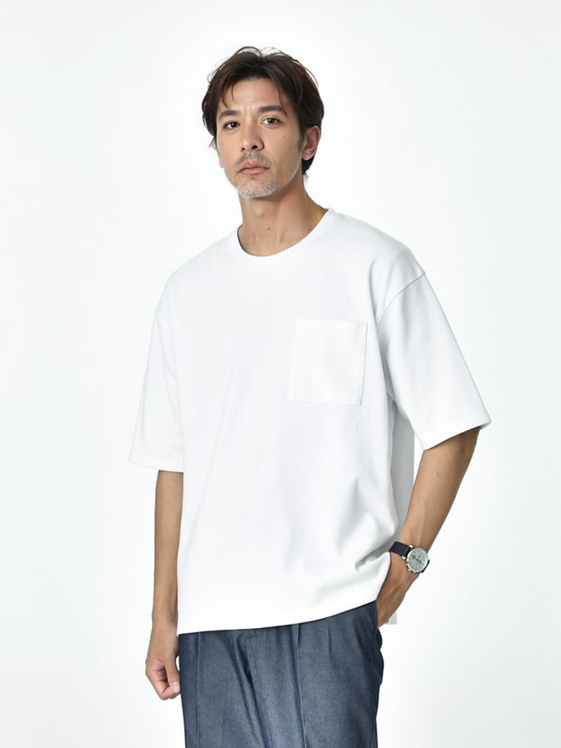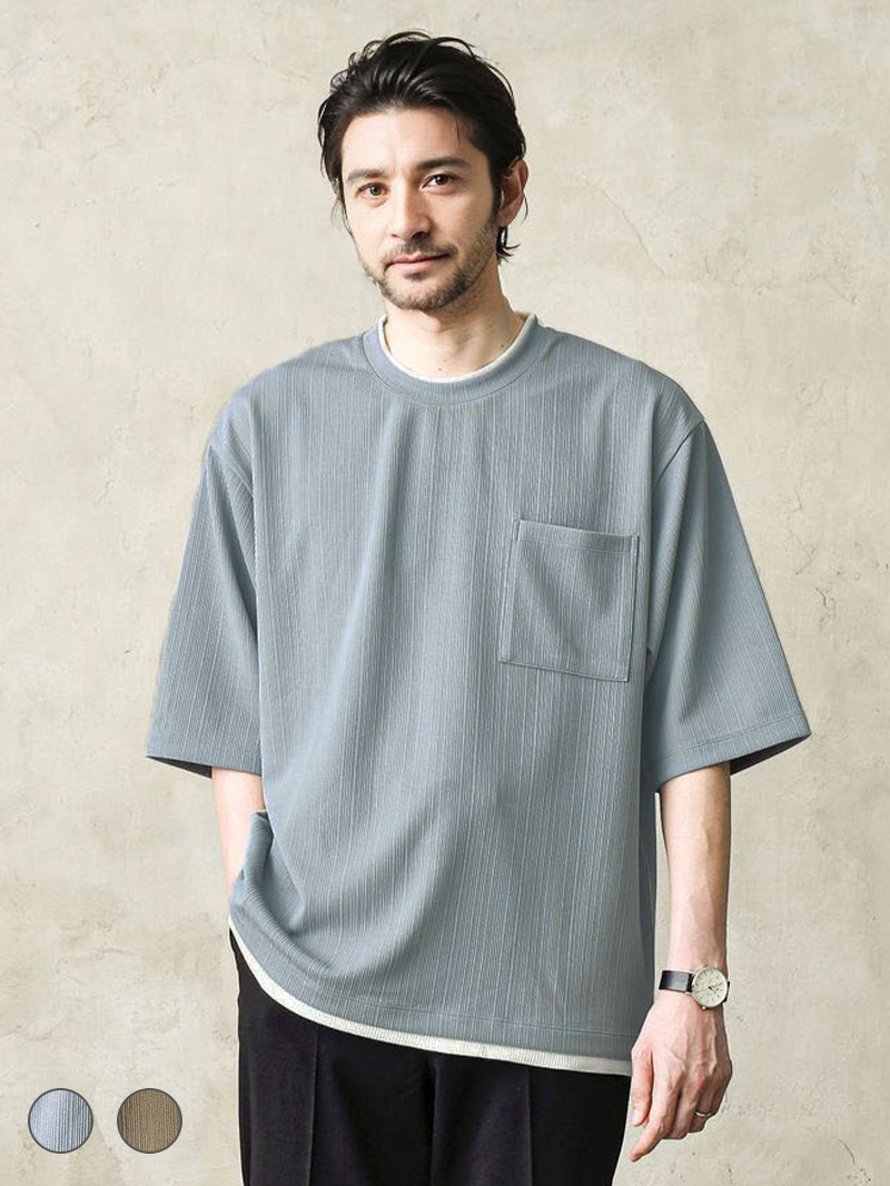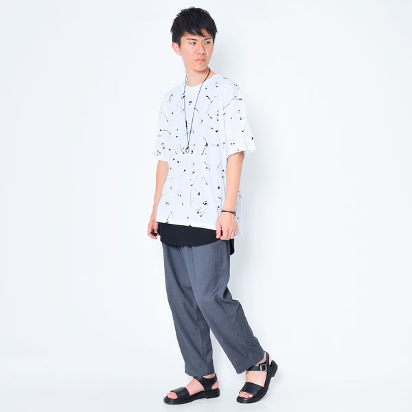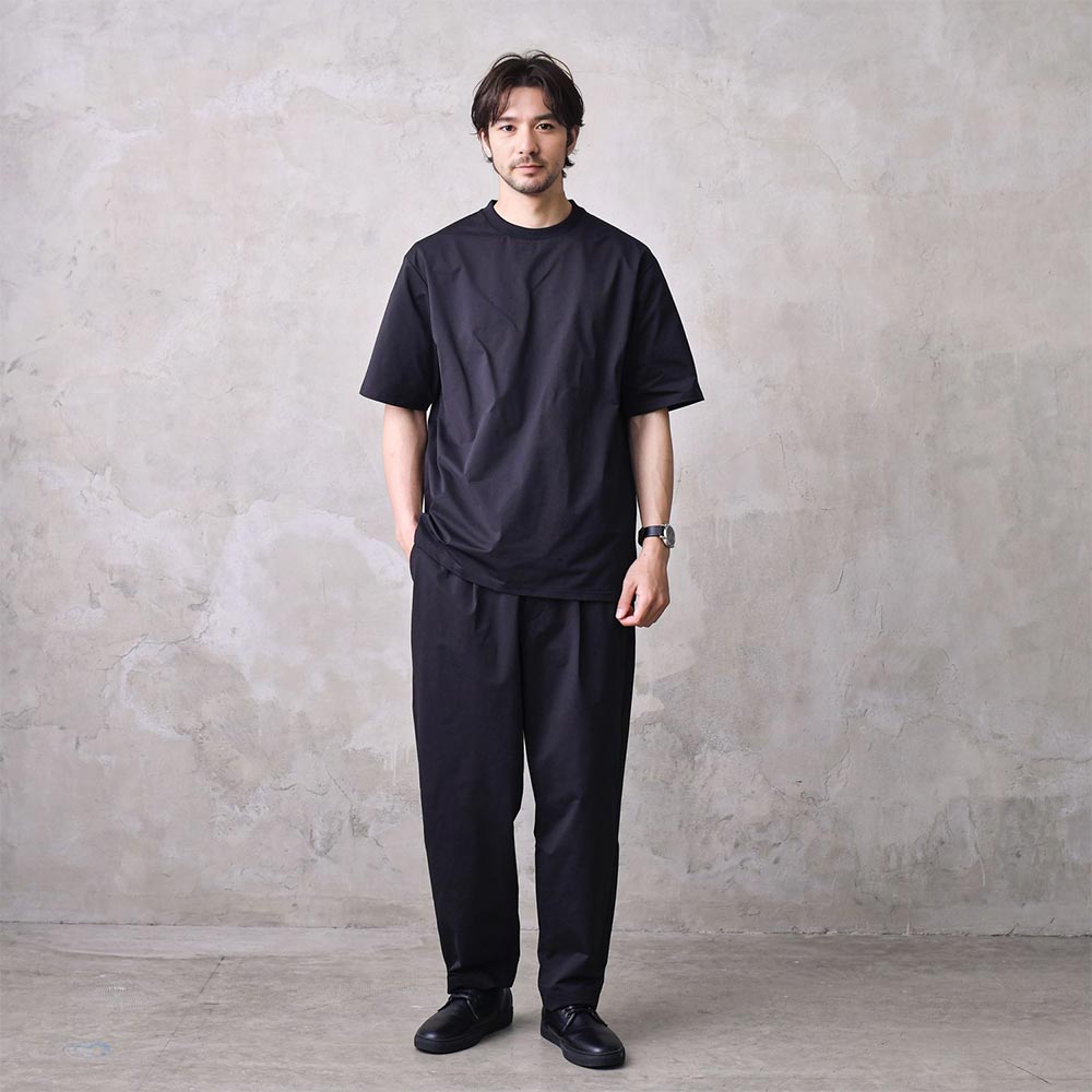 半袖バンドカラーシャツとワイドフィットタフTシャツで涼しさとカジュアルさを演出。