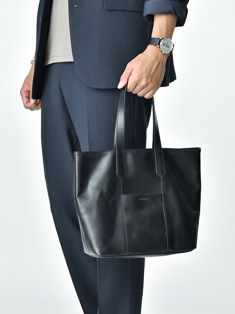 黒のレザーシューズとトートバッグが全体を引き締め、大人の余裕を感じさせるスタイルに仕上がっています。