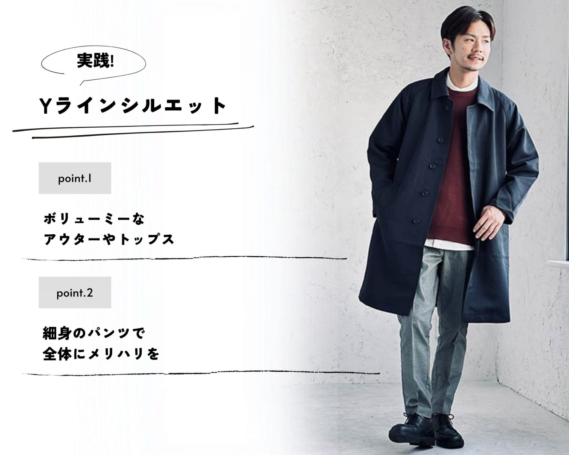 「Yライン」シルエットは、上半身にボリュームがあり、下半身は細身のアイテムでスッキリさせたシルエット。