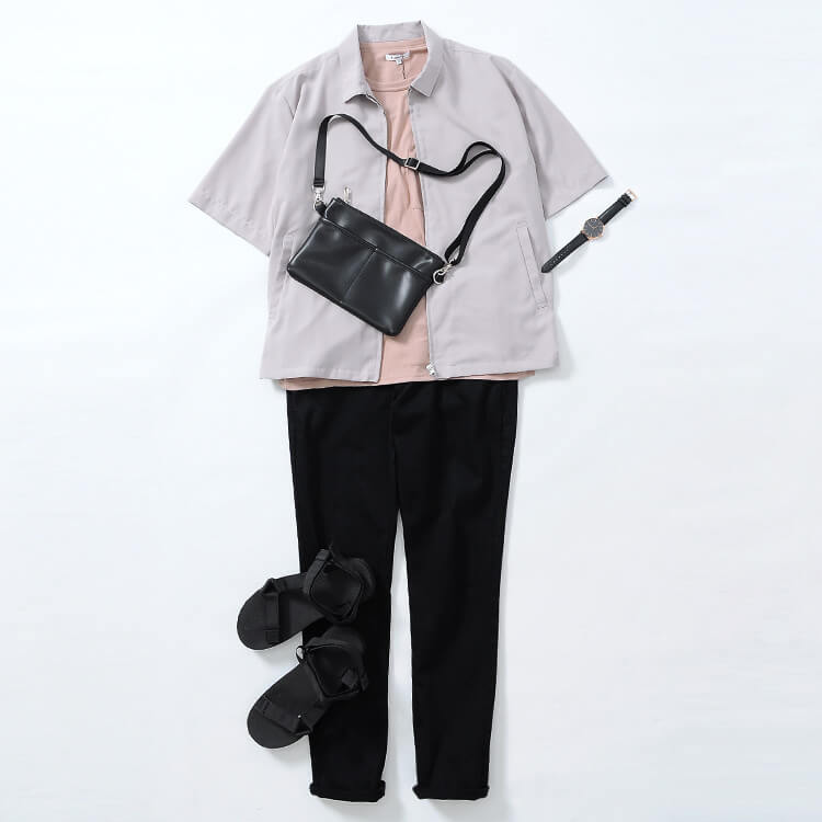 サコッシュなどの黒アイテムを追加すれば、コーデがグッと締まり男性的な印象もUP!ピンクとグレーの淡い色が優しい印象を与えてくれるので、親近感を演出することもできますよ!