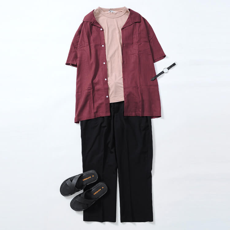 BIGシャツにワイドパンツを合わせてラフなシルエットをつくることで、配色だけでなくシルエットでも男らしさを演出することができ、ピンクの可愛らしさを抑えた着こなしをつくることができます。
