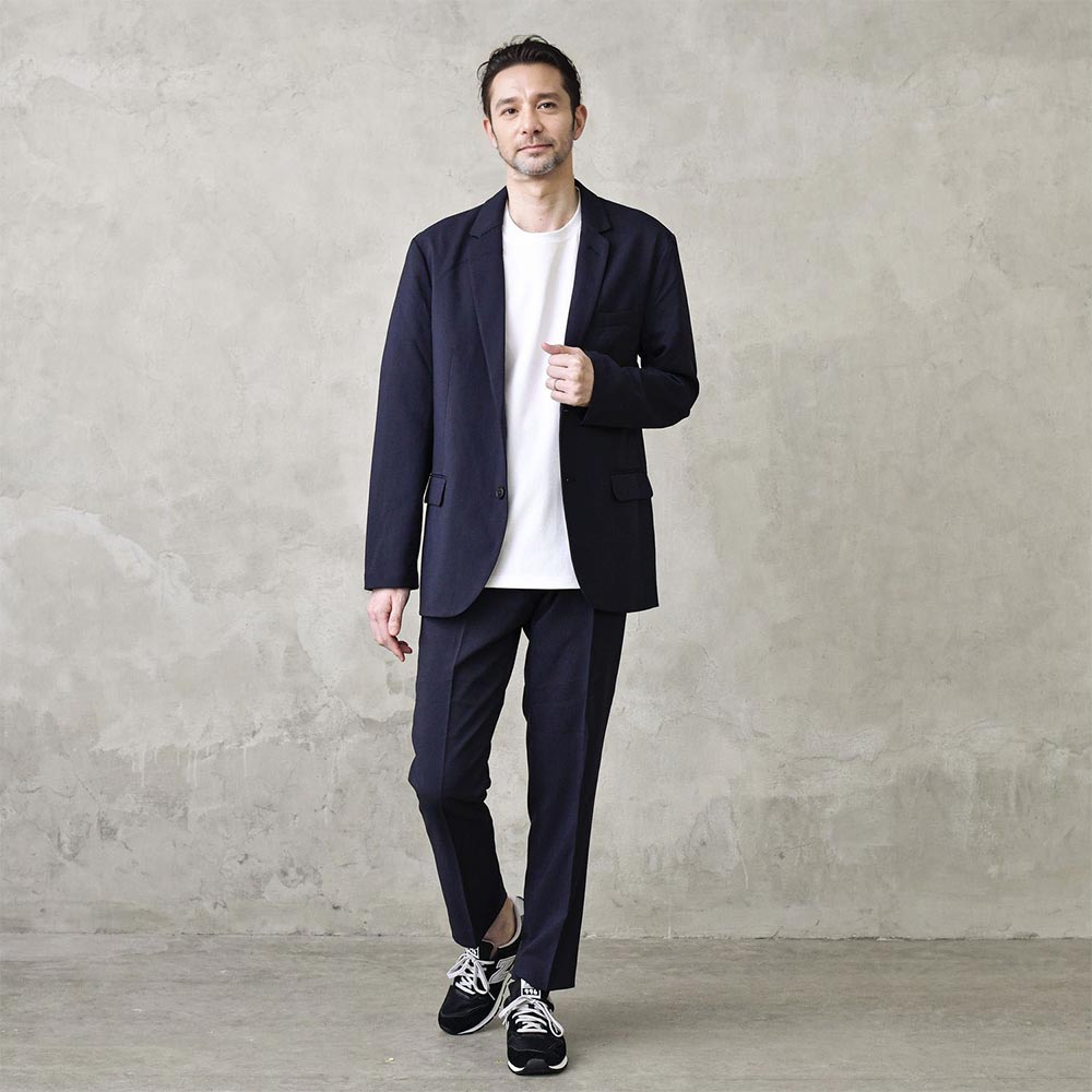 また細身のサイズ感のカットソーを選ぶことで、ジャケットを脱いでもスマートな印象をキープできます。