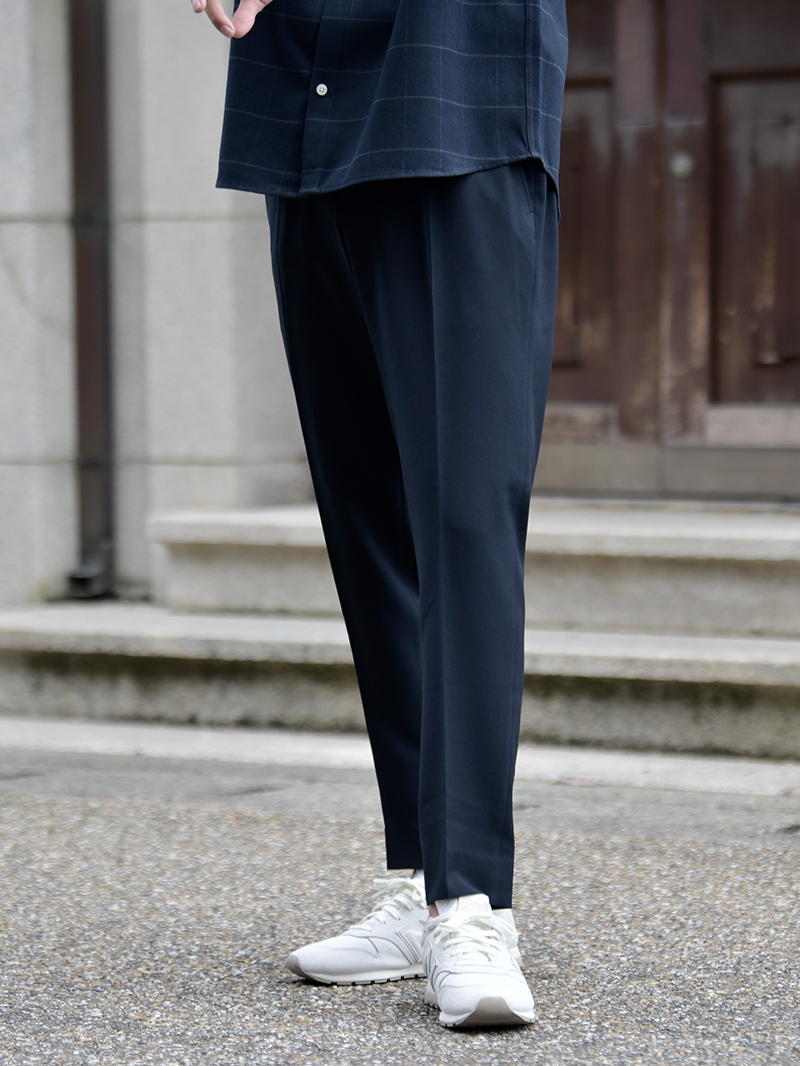 パンツにはテーパードデザインのスラックスを選び、スタイリッシュに仕上げましょう。