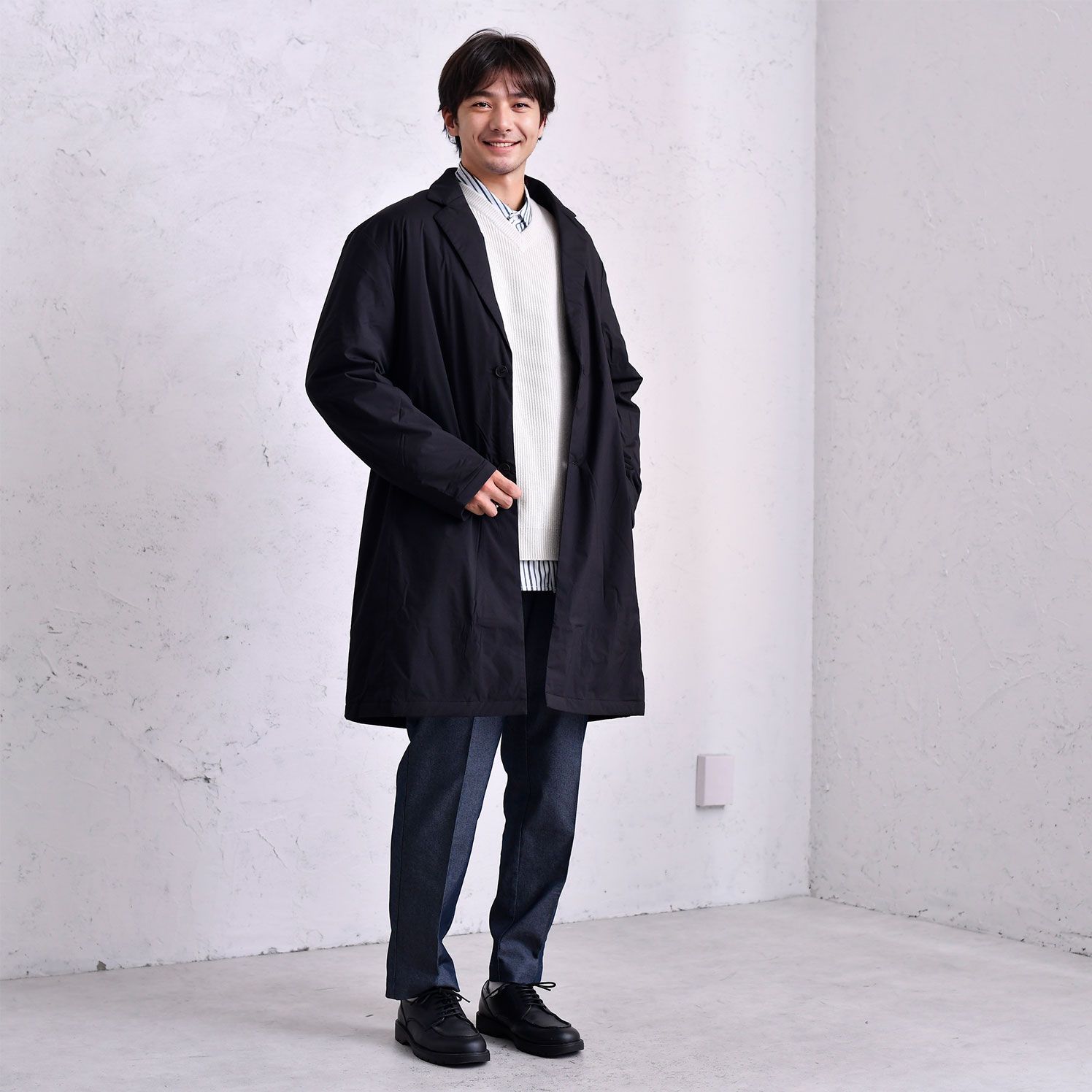 コートのフロントを開けることで、さらに縦のラインが強調されて高身長に見える効果も。