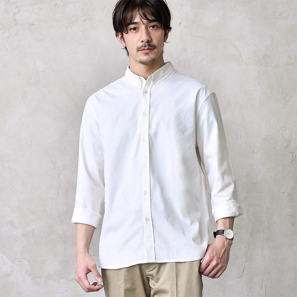 清潔感あふれるシルエットと、オックスフォード生地ならではの適度なハリが特徴のボタンダウンシャツ。表面は上品な光沢があり、温泉旅行で好印象を与えられます。