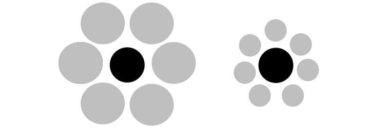 同じ大きさの黒の円ですが、周りの円の影響で黒の円の大きさが違って見えるという錯覚です。