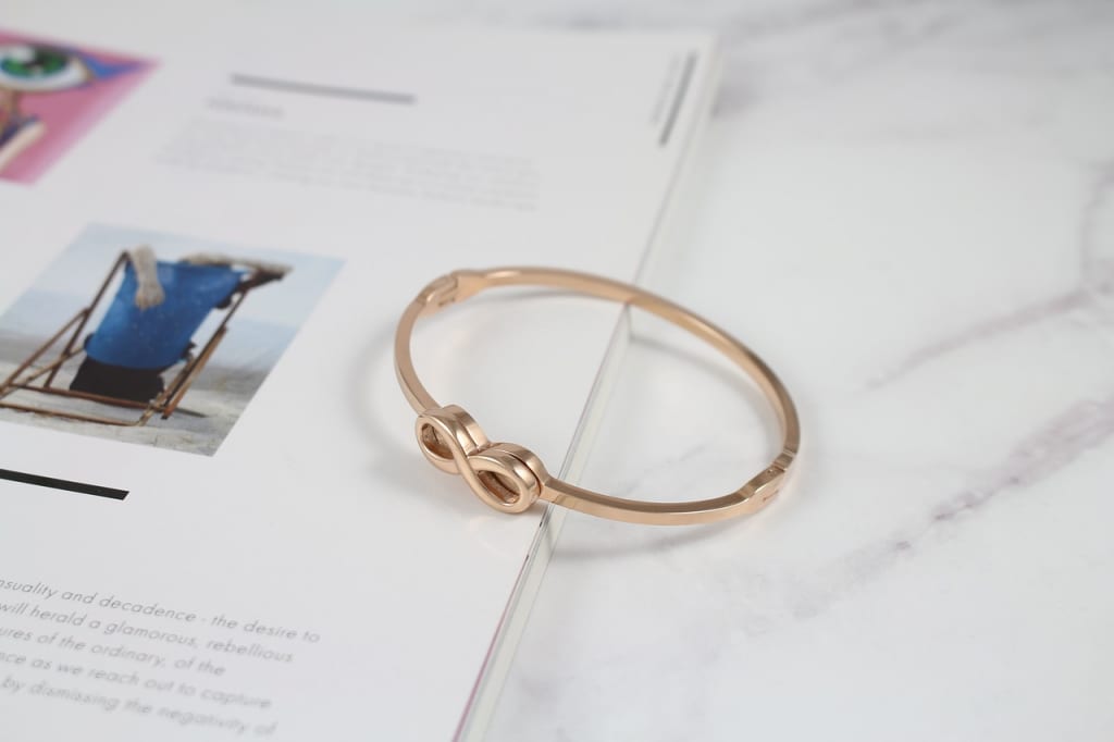 手首などに取り入れるアクセサリーをバングルといい、留め具が付いていない物を差します。
