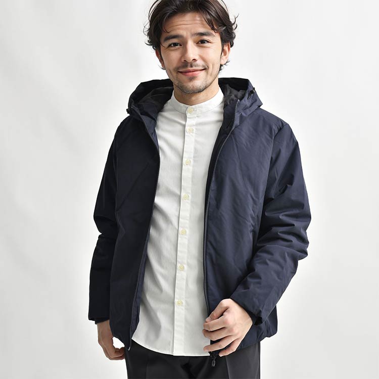 テクニカル2WAYマウンテンパーカーとバンブーバンドカラーシャツを合わせた、通勤時に最適なビジネスカジュアルスタイル。