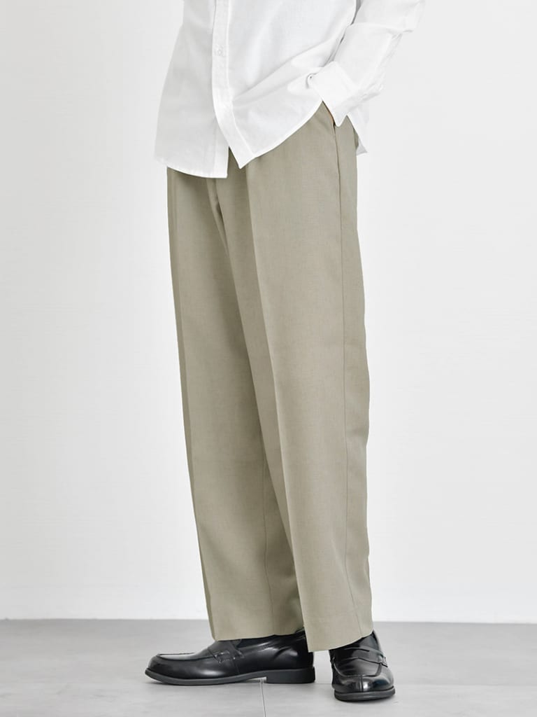 ワイドでもテーパードでもない、絶妙なストレートが特徴の、ビジネスにもカジュアルにも対応できる万能シルエットパンツです。