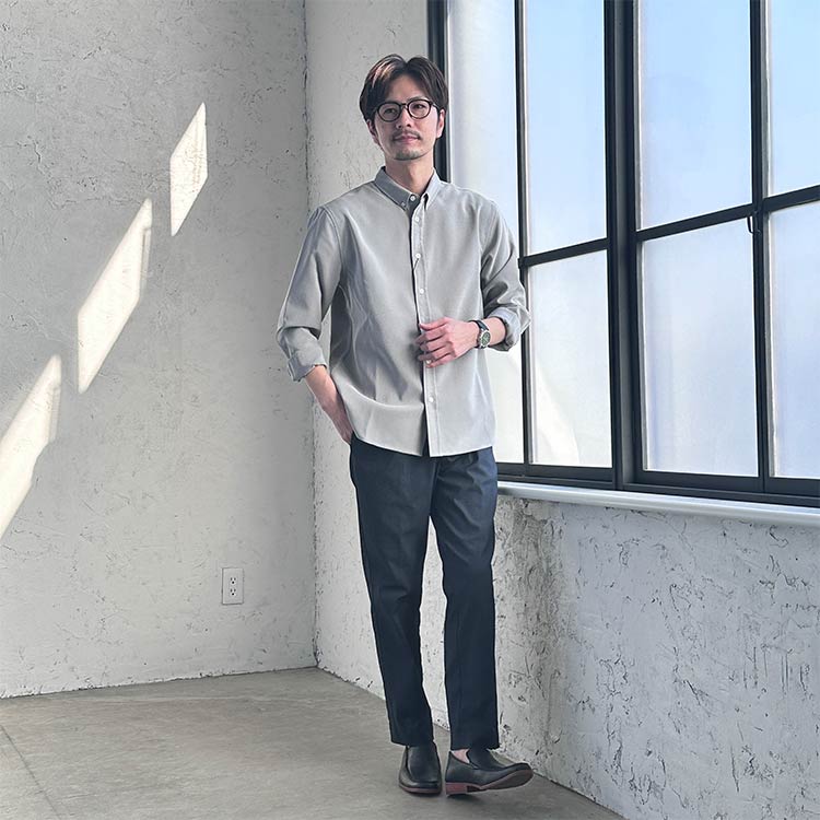 「テック半袖コーチシャツ」にブラックスリムパンツを合わせて、夏のオフィスカジュアルの基本であるIラインシルエットを作っています。