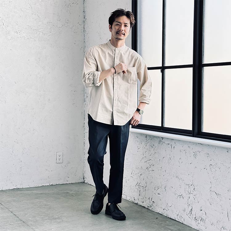バンドカラーシャツ×スリムパンツのシンプル夏コーデ