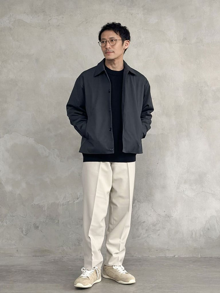 さらにインナーとアウターの色を統一することで、コーディネートに一体感が生まれ、スリムな印象に。