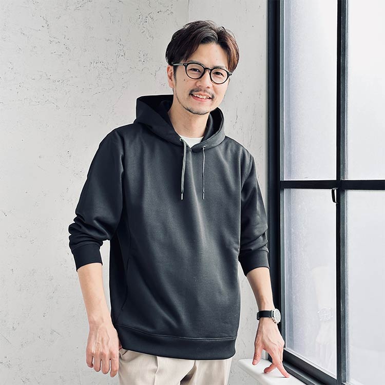 艶感と張りがある生地を取り入れたキレイめプルパーカーは、取り入れることで若々しいオシャレな印象を与えることが可能になります。