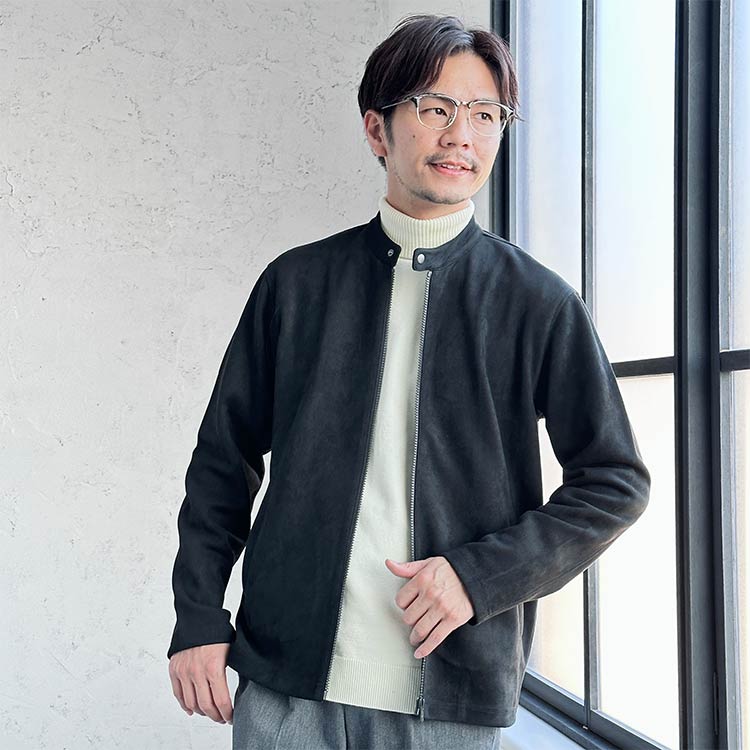 フェイクスエード素材を使用したシングルライダースジャケットは、伸縮性があるのでストレスなく着こなすことが可能です。