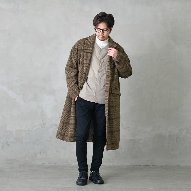 エレガントタイプは大人顔なので、キレイめな「チェスターコート」を合わせて着こなすのがおすすめ。チェック柄のチェスターコートなら、華やかさも演出できます。