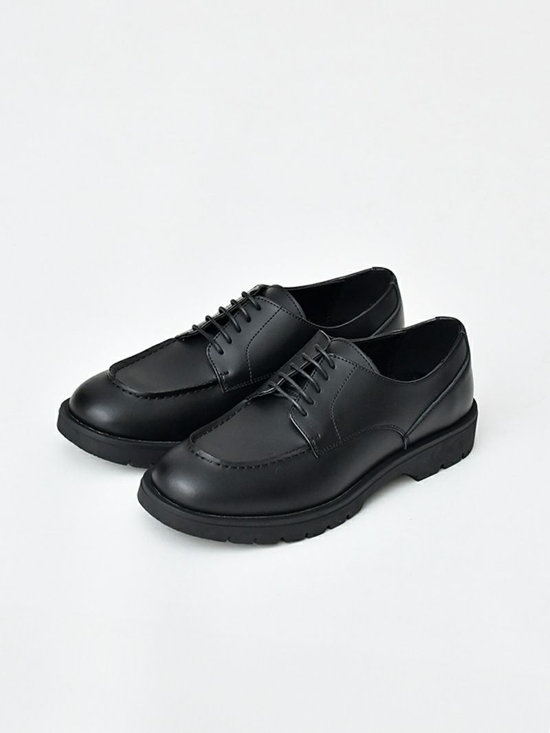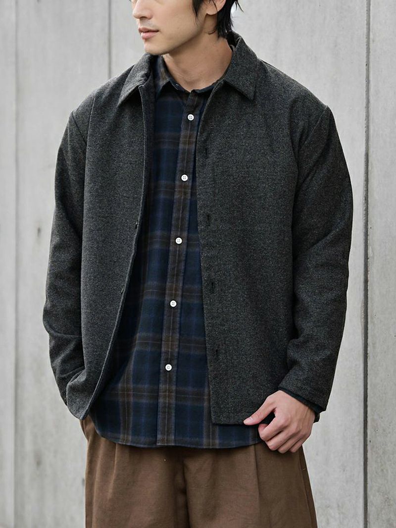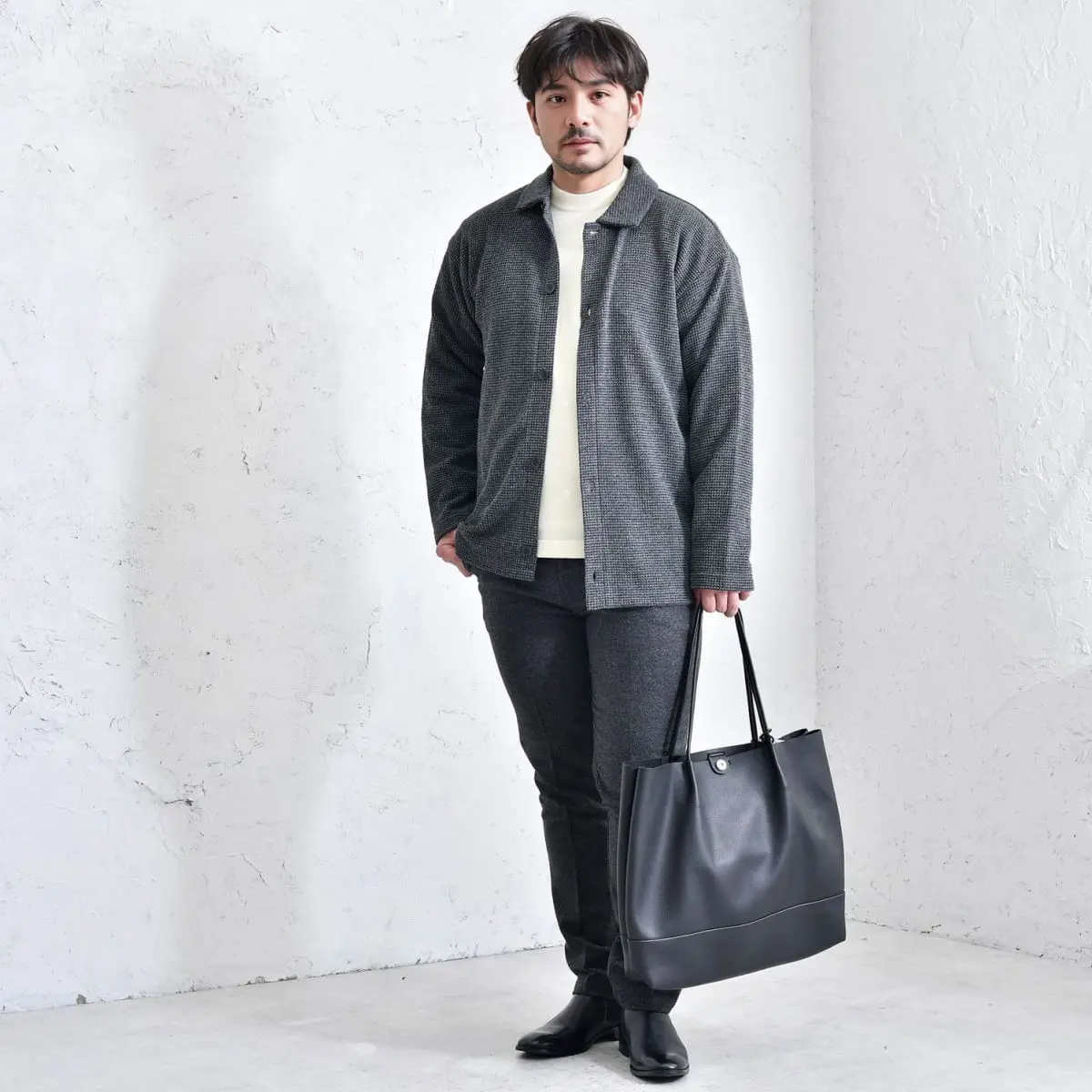 杢チャコールのシャツジャケットを主役に、オフホワイトのニットで明るさをプラス。杢チャコールのパンツで統一感を出し、ブラックのシューズで全体を引き締め。女性からの好感度も高まる、スタイリッシュな日常スタイルです。