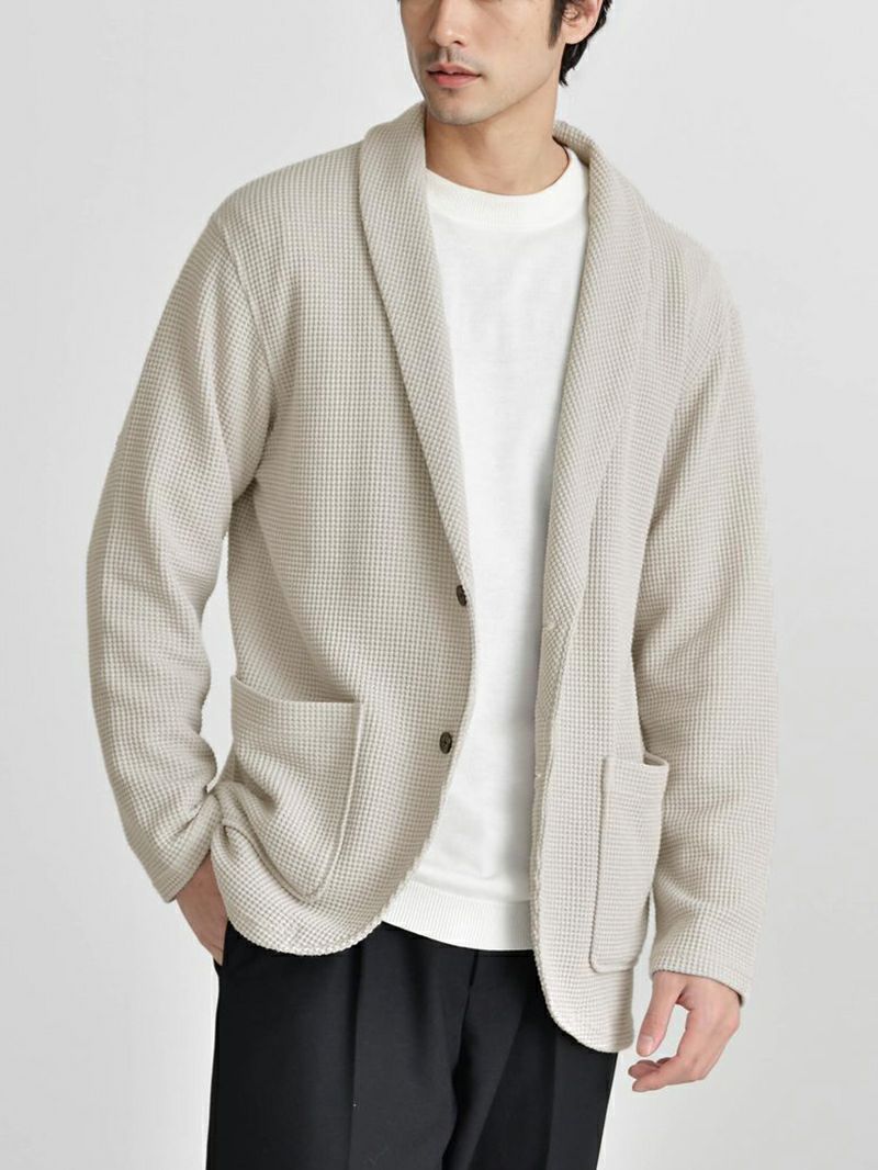ベージュのワッフルテーラードカーディガンをメインに、オフホワイトのハイゲージジャケニットとブラックのテーパードパンツを組み合わせて、上品な雰囲気を演出しましょう。足元はシンプルなブラックスニーカーで抜け感をプラス。