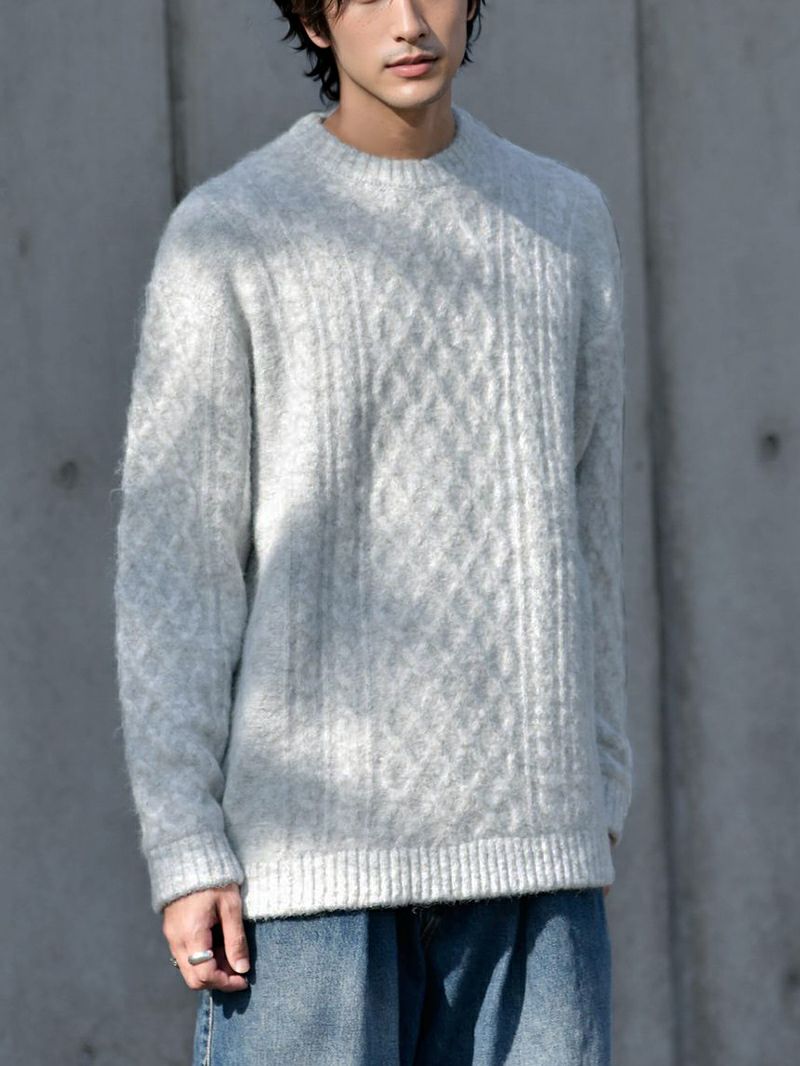 オフホワイトの裏起毛クルーネックにブラックのテーパードパンツを合わせ、リラックス感あるスマートな印象。グレージュのダッフルコートで暖かく、コーヒー色のニットで深みを加えます。