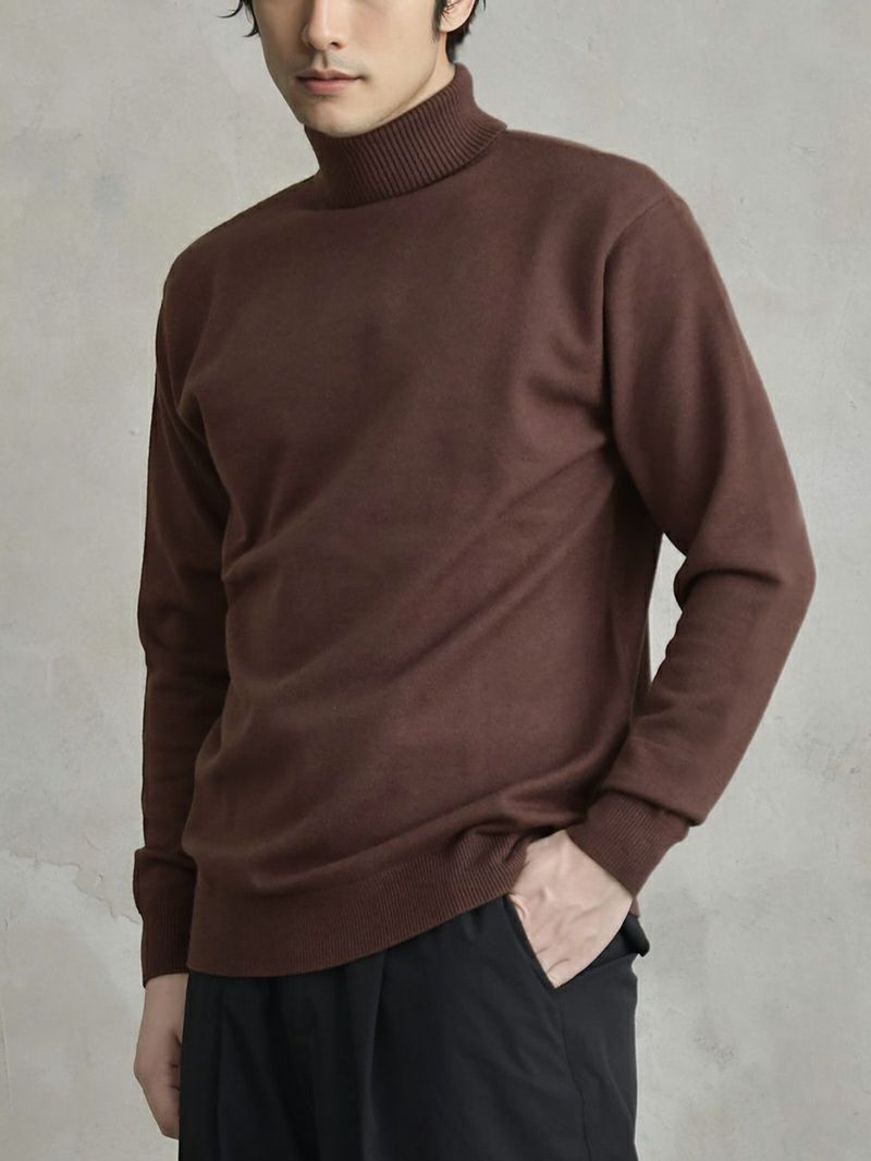 ブラウンのコーデュロイジャケットにオフホワイトのタートルネックで、高級感ある秋冬の装い。テーパードパンツとブラックのレザーシューズで、スマートかつ落ち着いた雰囲気に。