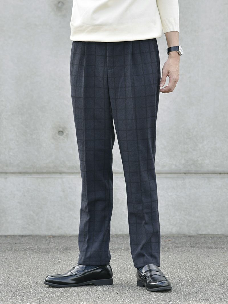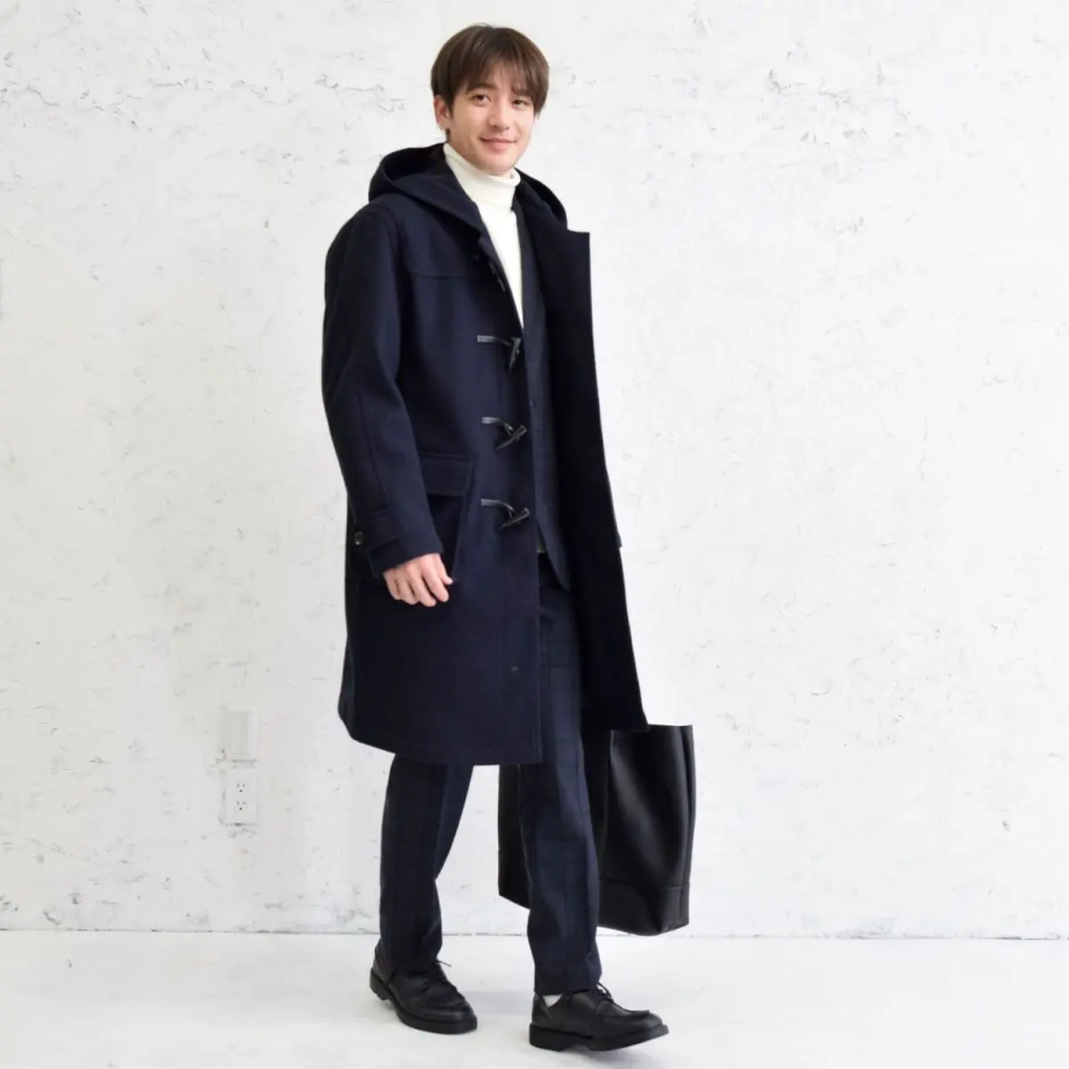 オフホワイトのハイゲージタートルネックを中心に、ネイビーチェックのテーラードジャケットとテーパードパンツで上品な印象を演出。ネイビーのダッフルコートで冬の寒さから身を守りつつスタイルを保ち、ブラックのレザーシューズで全体を引き締める。上品かつモダンなスタイルで、どんなシーンにもマッチします。
