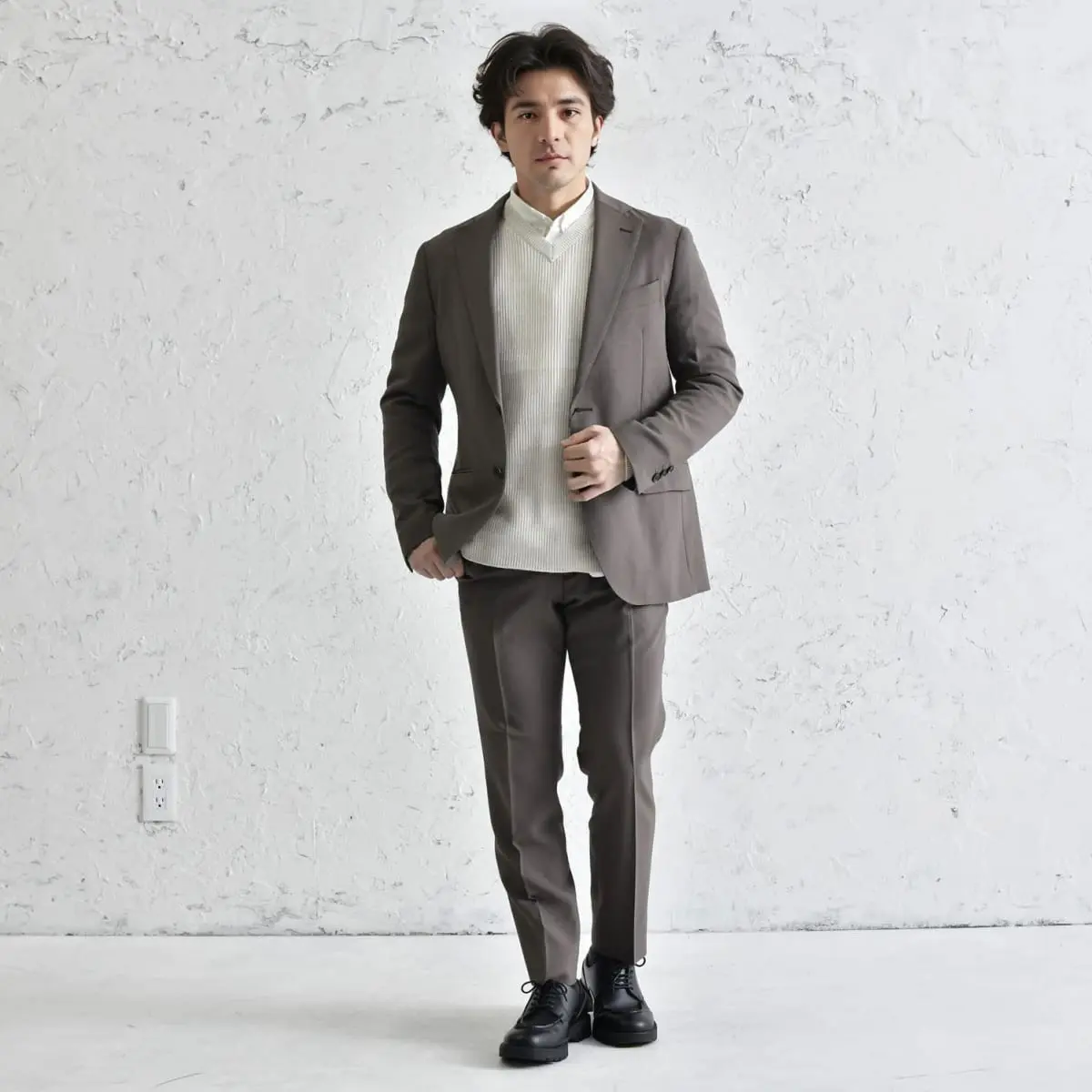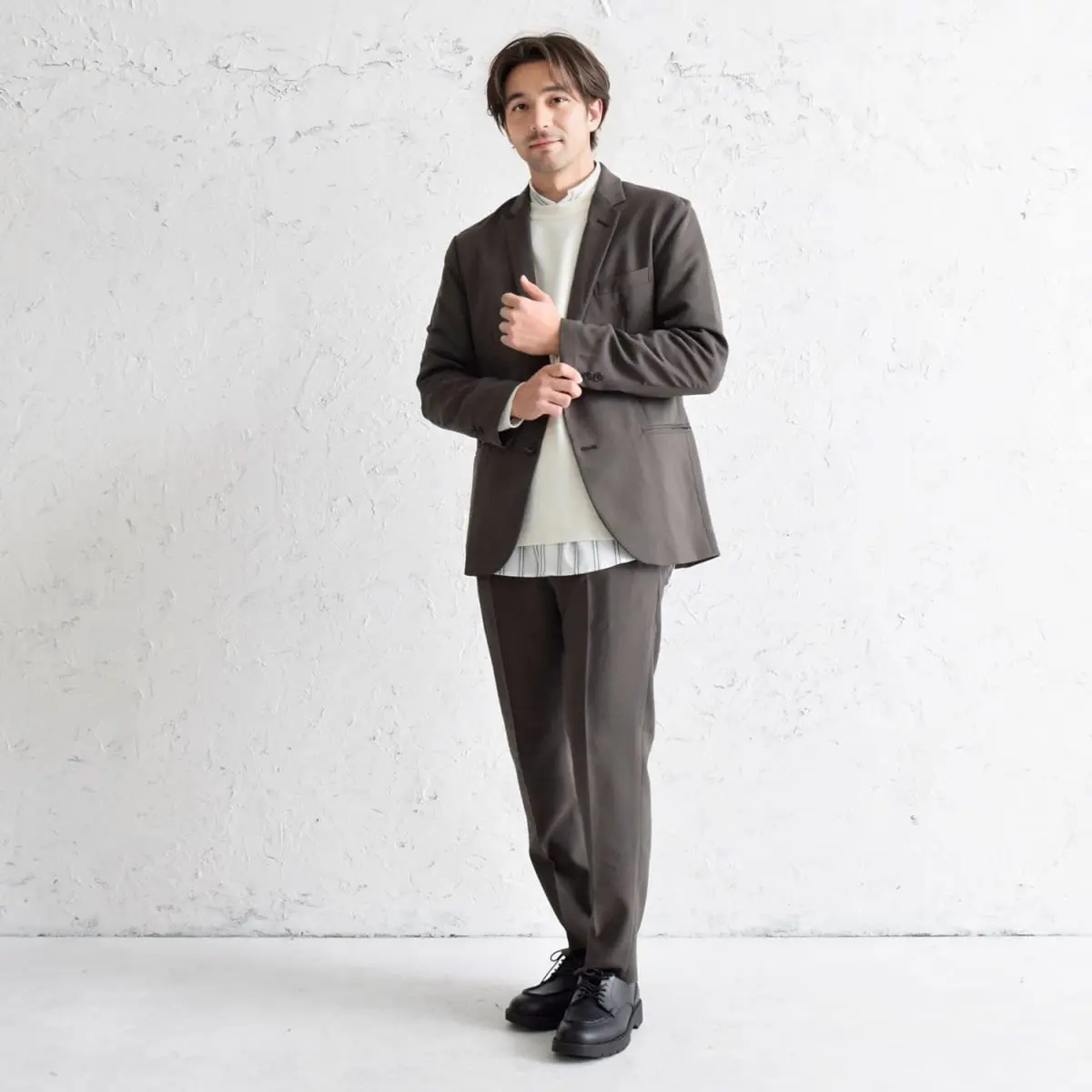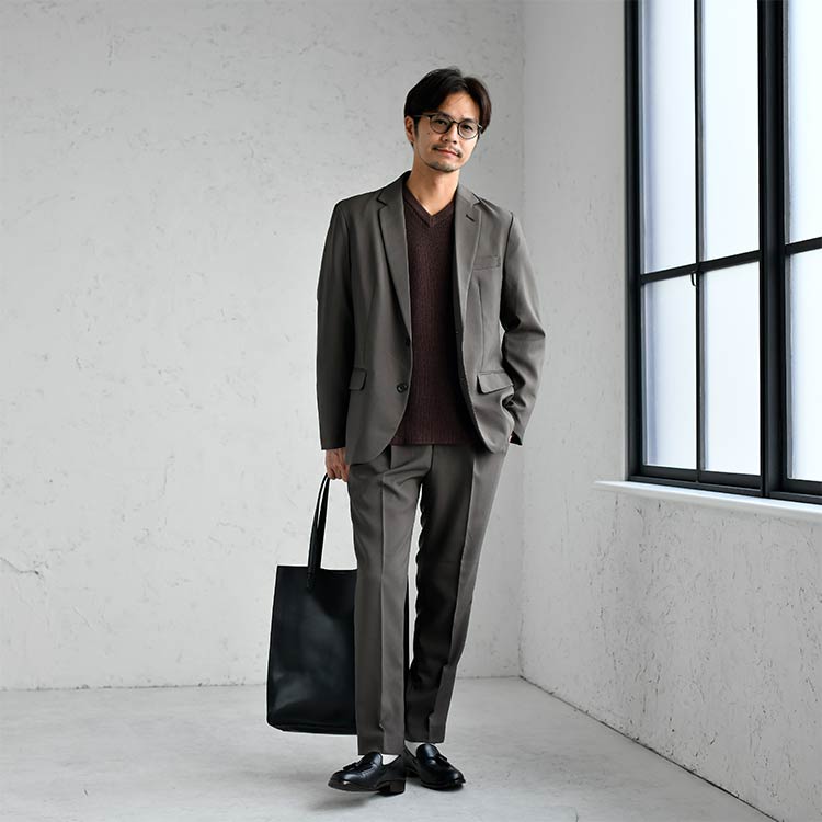 シックブラウンのテーラードジャケットとテーパードパンツで統一感のある上品なスーツスタイルを作り出し、アイボリーのVネックセーターで柔らかさと明るさを加えます。ホワイトの長袖ボタンダウンシャツが清潔感をプラスし、ブラックのレザーシューズで全体を引き締め。どんなシチュエーションでも好感を持たれるスタイリングです。