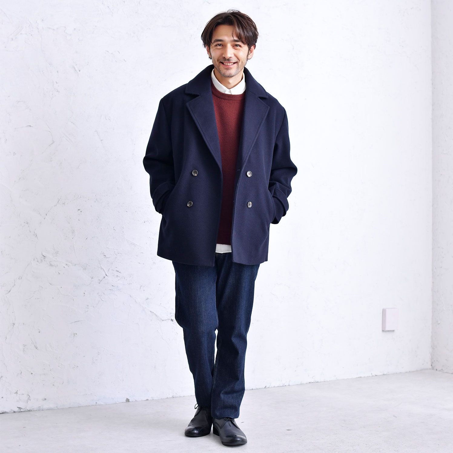 デートに最適な組み合わせ。ネイビーのPコートにオフの無地ネルシャツ、テーパードパンツの上品なコーディネート。テラコッタのクルーネックニットで差し色を。シックなブラックのレザーシューズで完成。