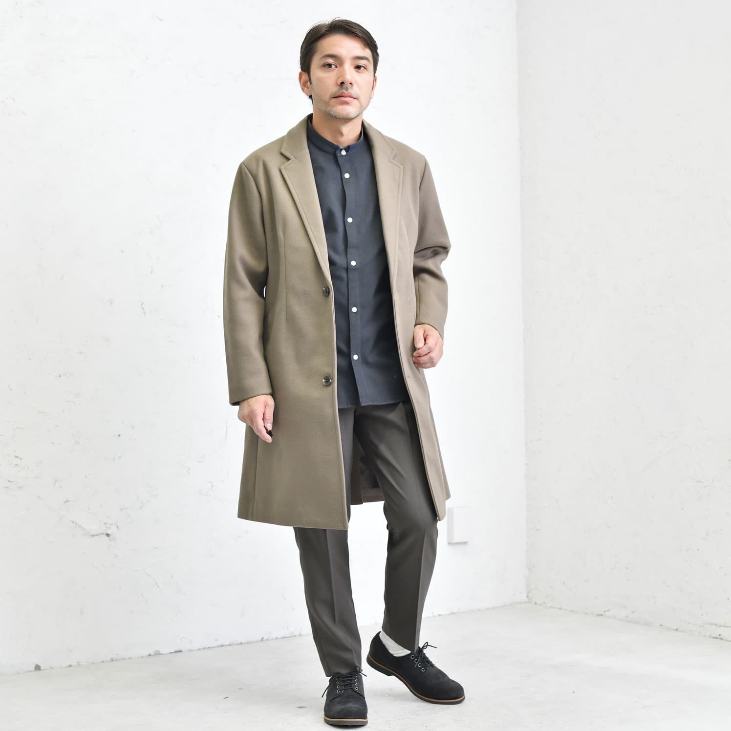 モカベージュのチェスターコートは、柔らかな色合いで上品な雰囲気を演出します。内側にネイビーのワッフルクルーネックを合わせることで、落ち着きのある大人の印象に。