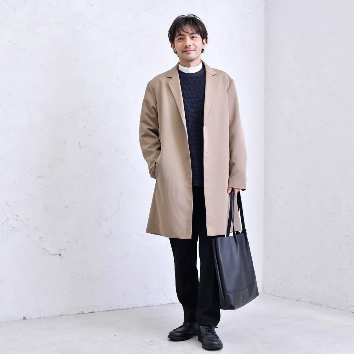 タートルネックニットにストレッチパンツを合わせ、グレージュのチェスターコートで品格を演出。ブラックのレザーシューズが全体を引き締めます。