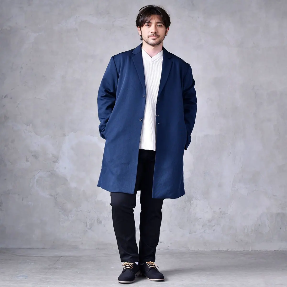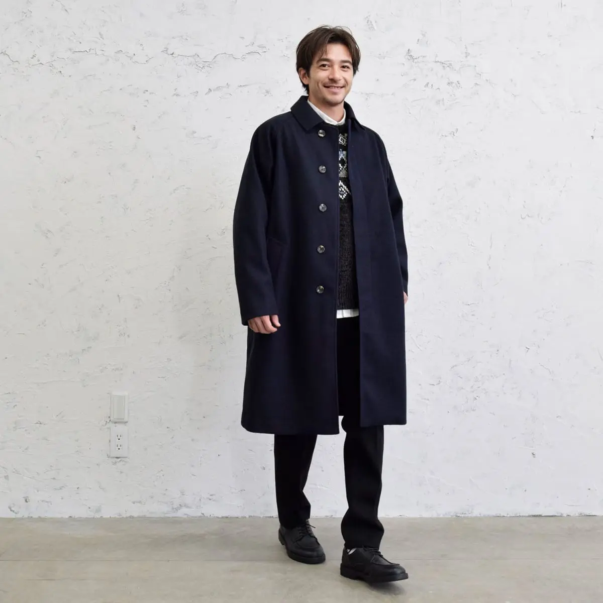 ネイビーのチェスターコートをメインに、清潔感のあるアイボリーセーターをインナーに。下はブラックのパンツで引き締め、足元は同色のシューズで統一感を出して、品のある大人の魅力をアピールします。