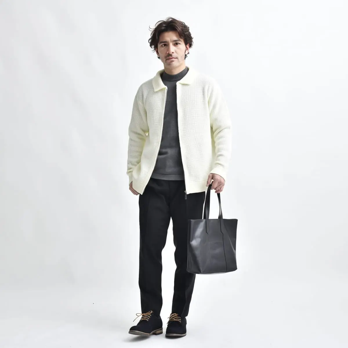 アイボリーのドライバーズニットを基調に、チャコール杢のハイゲージジャケニットで大人の落ち着きをプラス。ブラックのテーパードパンツでスマートな印象を高め、同色のキャンバスシューズとレザートートバッグで統一感を出しましょう。