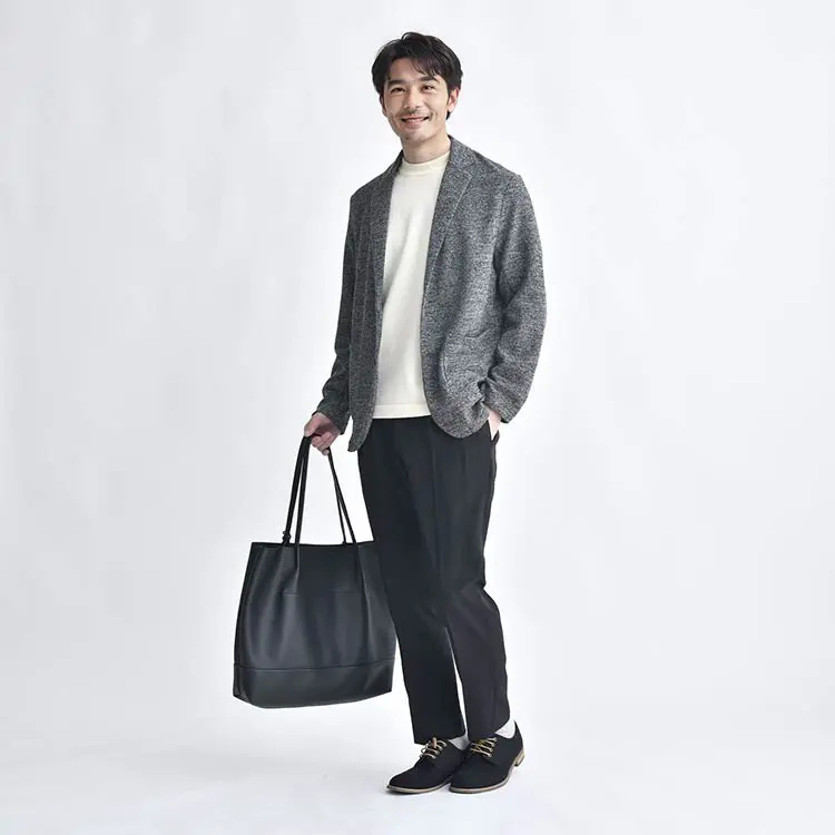 テーラードジャケットを主役に、ライトグレーのセーターをインナーに選ぶことで、洗練された大人の魅力が引き立ちます。ブラックのパンツとシューズで統一感を持たせつつ、トートバッグで個性をアピール。