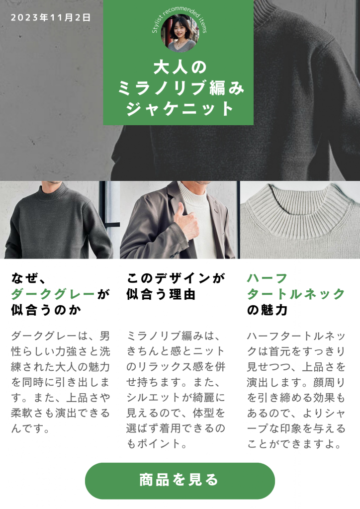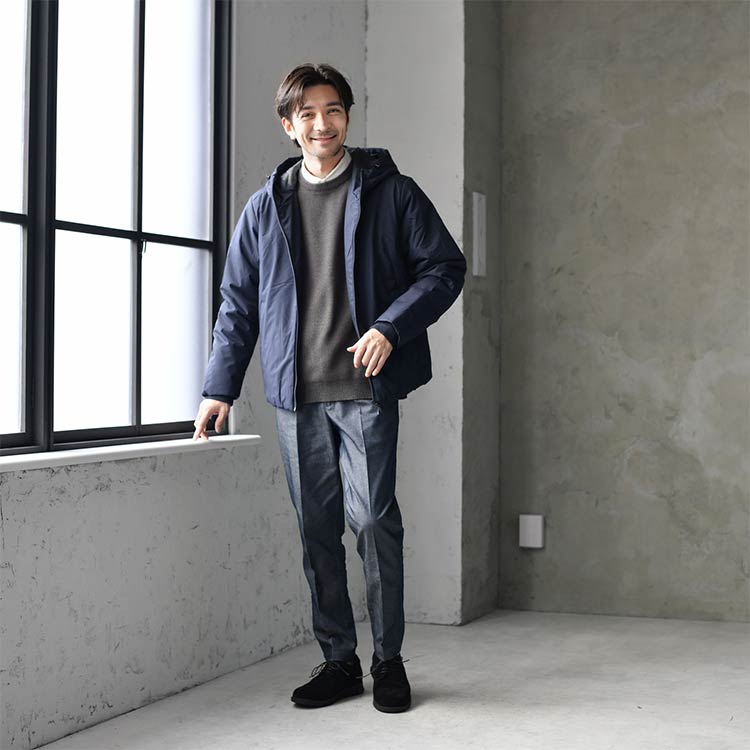 グレーのオックスシャツをメインに、ネイビージャケットとパンツでシャープな印象に。アイボリーのニットが優しい雰囲気を加え、大胆かつ男らしいスタイルに。