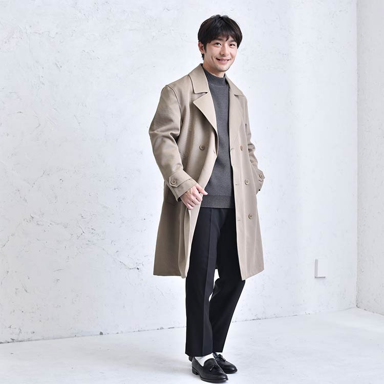 ステンカラーコートで大人の品格を演出。ニットとモックネックTシャツでレイヤードし、ブラウンパンツでこなれ感を。