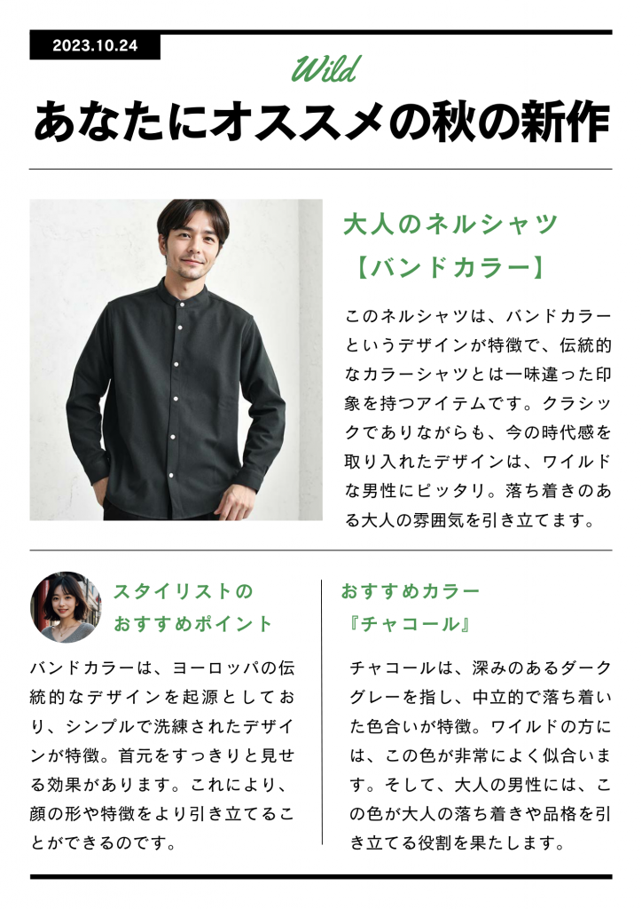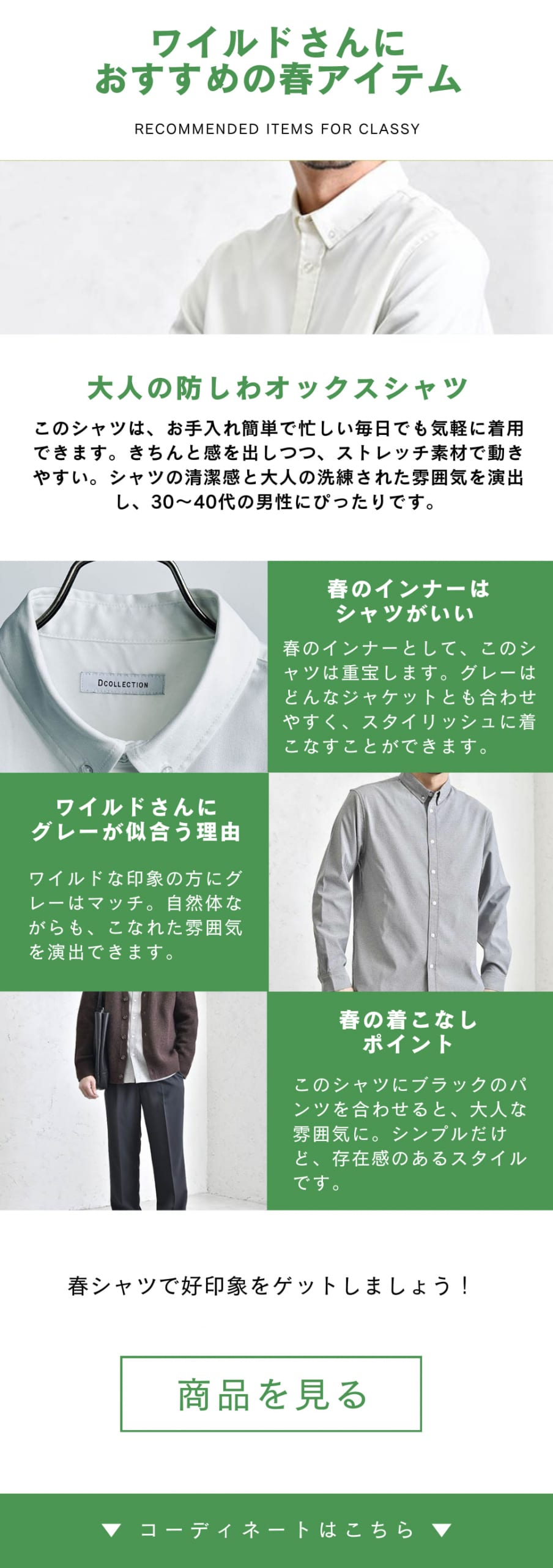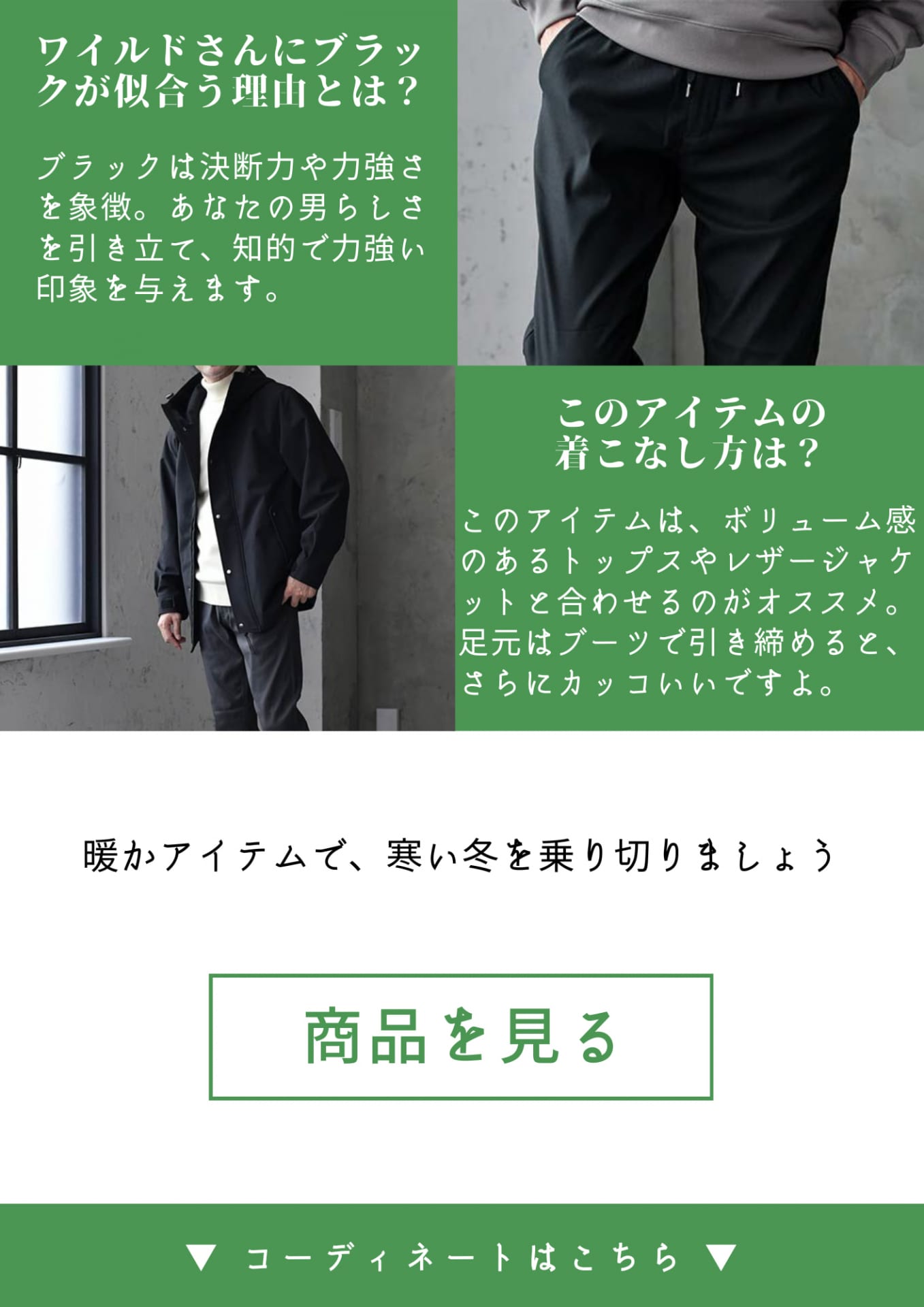 ダークカラーをベースに、グレージュのダッフルコートで柔らかさをプラス。チャコールのバンドカラーシャツが更にクールな雰囲気を出して、女性からの好感度もアップ!ワイルドなあなたにピッタリの組み合わせです。