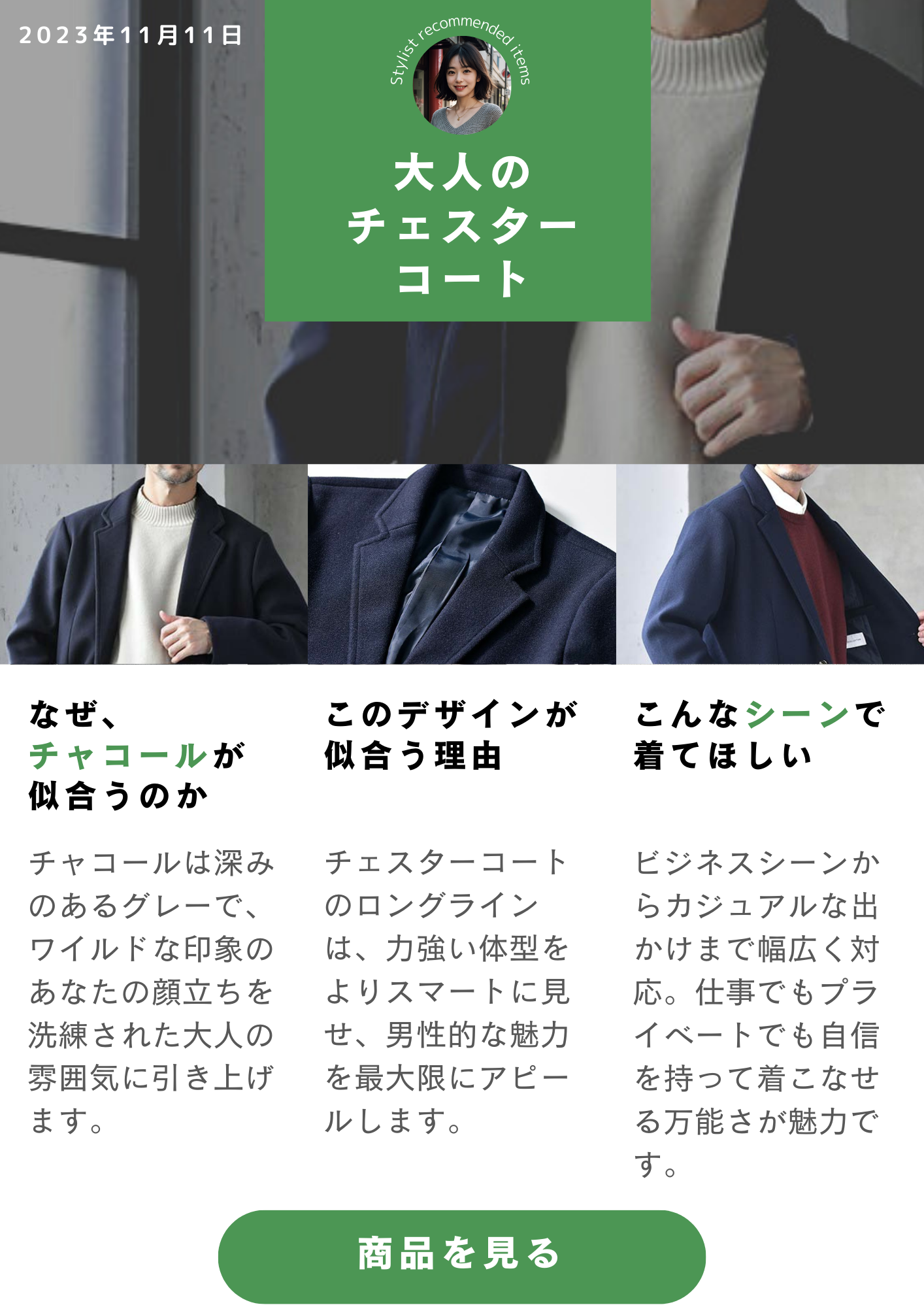 スチャコールのチェスターコートにアイボリーのジャケニットを合わせて、清潔感とワイルドさの雰囲気を演出。デートにもぴったり!