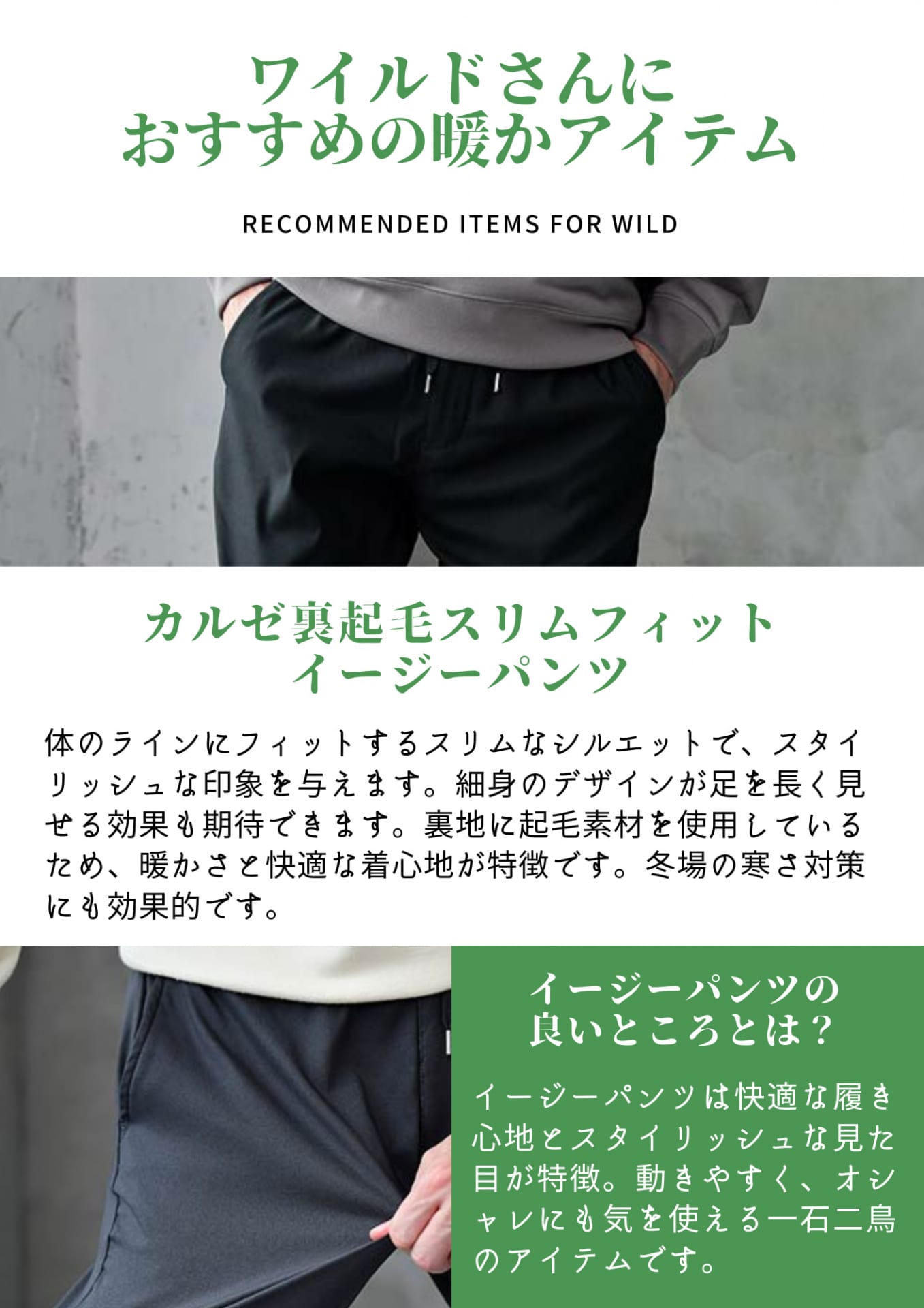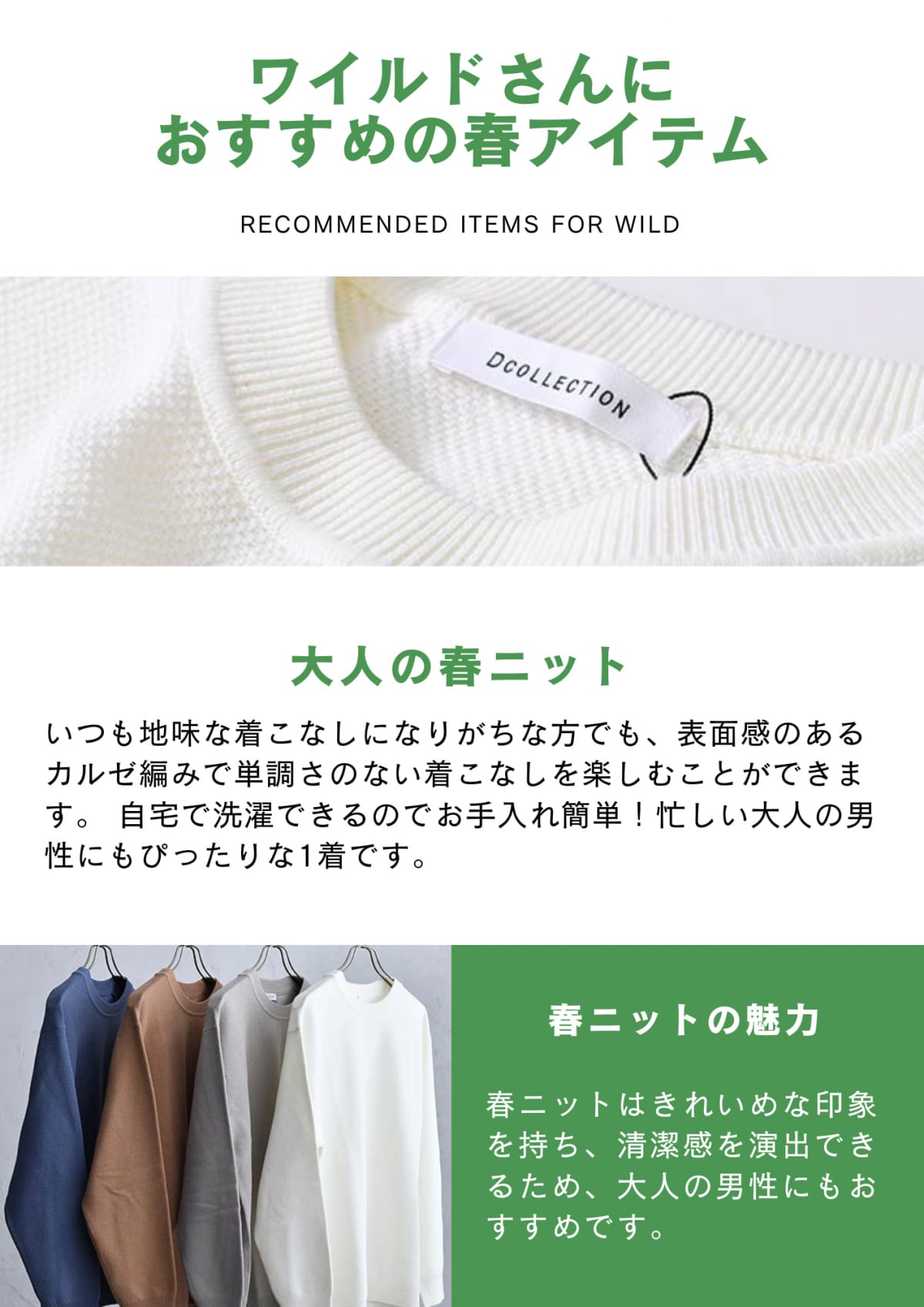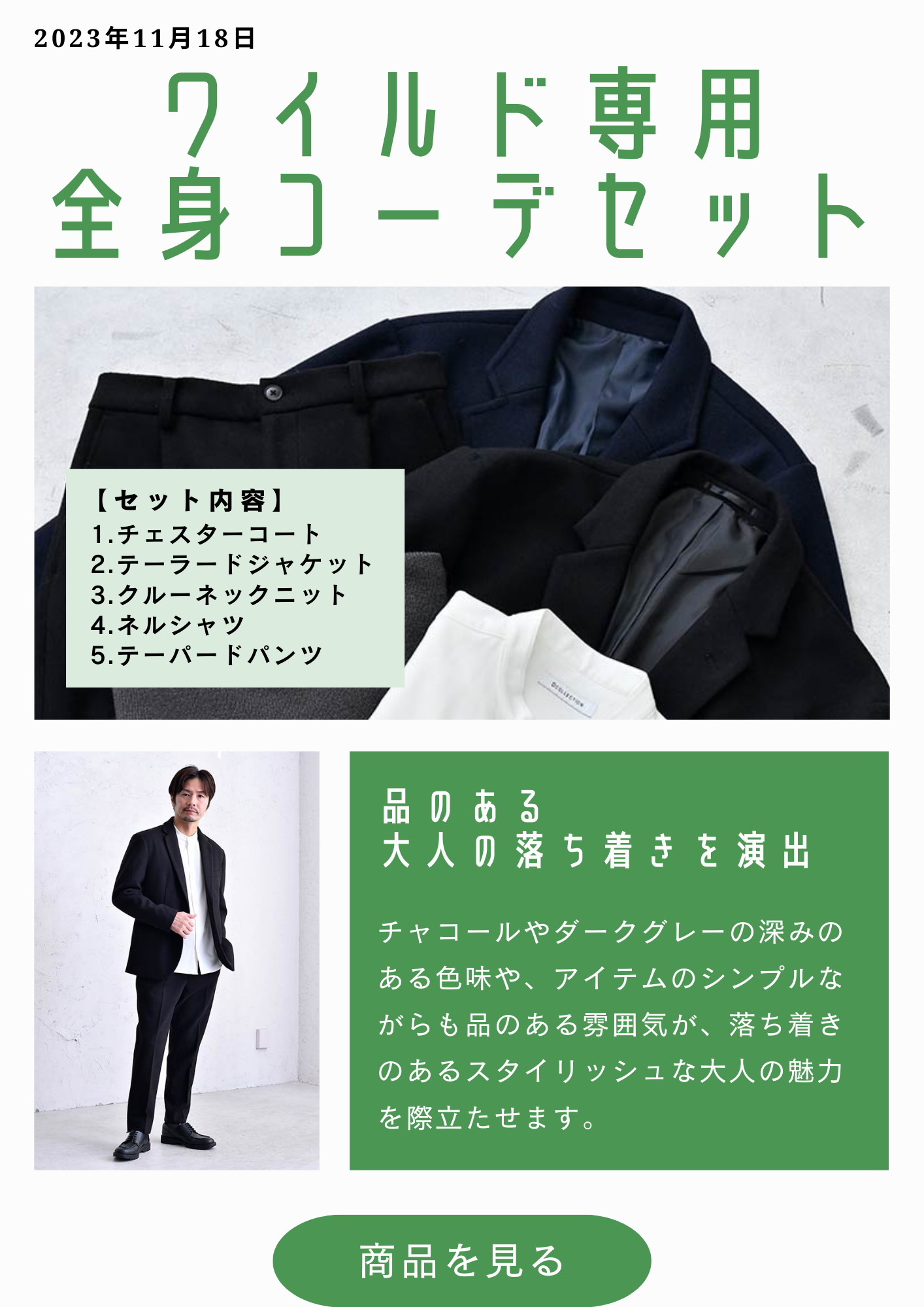 ケーブルニットの質感で渋みを、チェスターコートとスリムパンツで都会的なスマートさを演出。ワイルドな中にも洗練された雰囲気を感じさせる着こなしです。