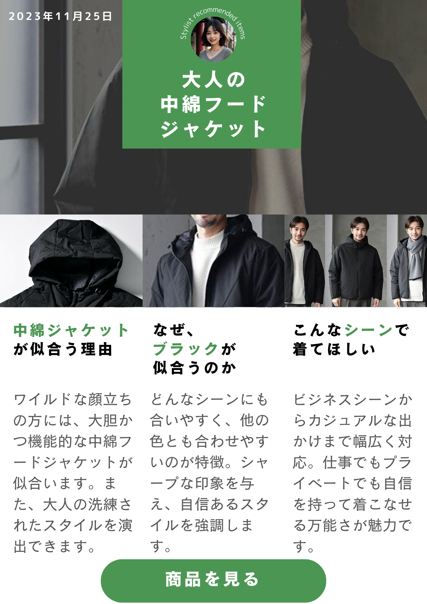 ブラックの中綿フードジャケットでアウトドア感を出しつつ、アイボリーのジャケニットで柔らかさを。キレイめのテーパードパンツや、足元にローファーをあわせることで都会的なアクセントを取り入れることができるので、オフィスカジュアルにも活躍します。